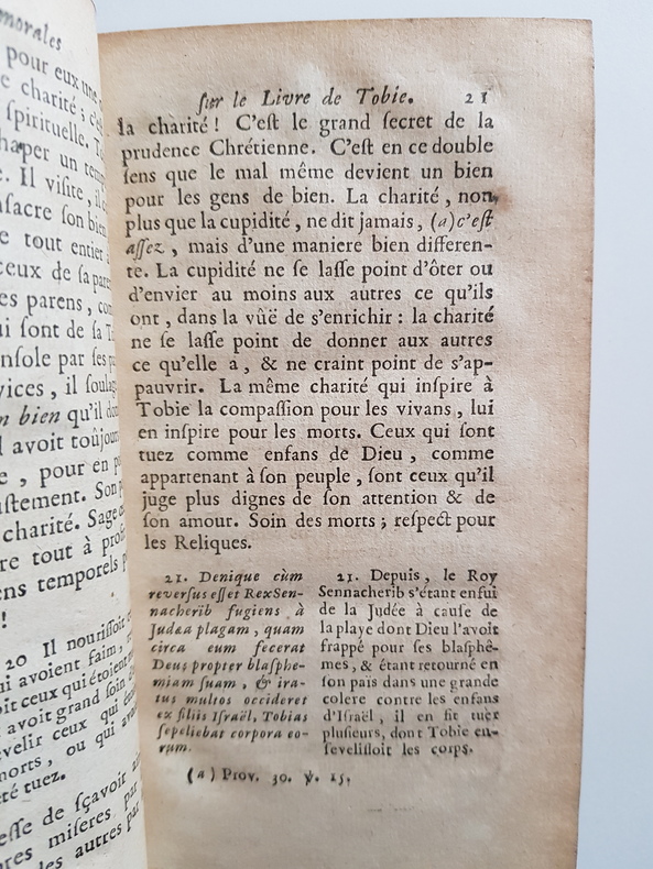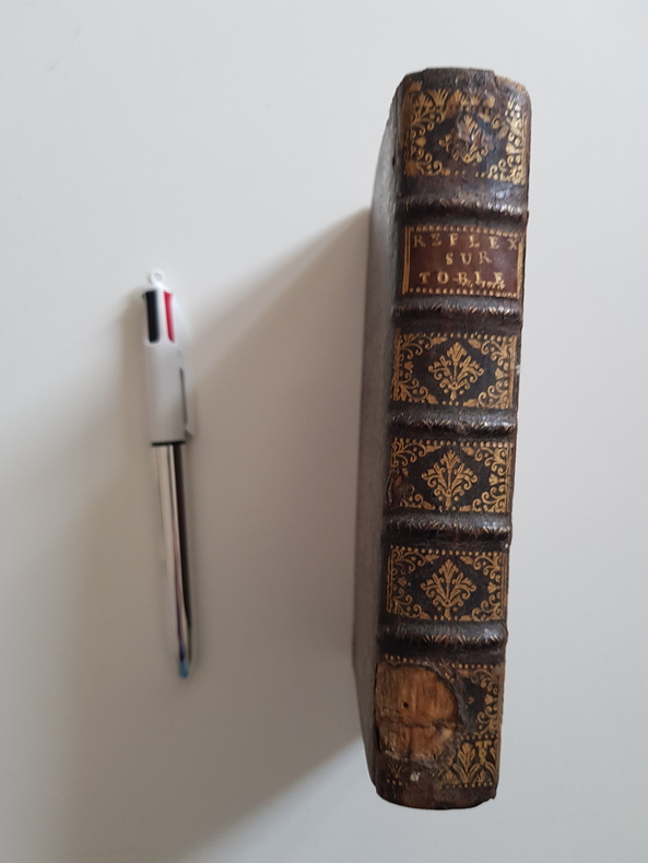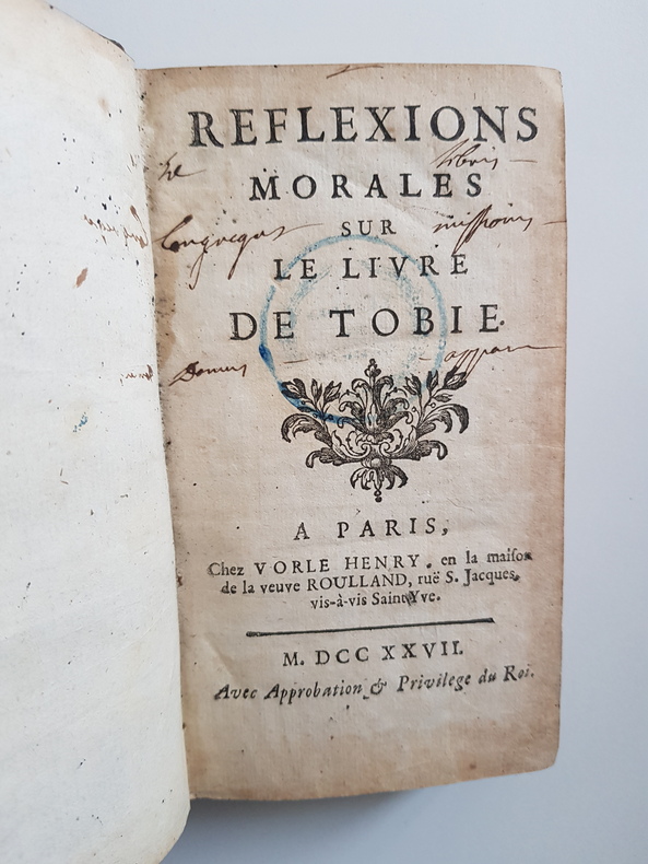 Titre : Réflexions morales sur le livre de Tobie Auteur : Anonyme Lieu : Paris Éditeur : Chez Vorle Henry, en la maison de la veuve Roulland, rue S. Jacques, vis‑à‑vis Saint‑Yves Date : 1727 Édition : Avec Approbation & Privilège du Roi Langue : Français et latin (citations de la Vulgate) Reliure : Plein veau marbré de l'époque ; dos à nerfs orné de caissons fleuronnés dorés ; pièce de titre en maroquin rouge « Reflex. sur Tobie » ; tranches lisses Format : in‑12 approximatif - 16,5 x 10 cm État : Bon état d'usage. Reliure solide mais frottée, coins émoussés, petits manques au bas du dos avec une ancienne éraflure circulaire ; mors par endroits craquelés. Intérieur légèrement bruni avec rousseurs éparses ; page de titre portant des notes manuscrites anciennes et une trace circulaire d'encre bleue ; papier généralement sain, impression nette. Contenu : Commentaire spirituel et moral sur le livre de Tobie, avec extraits latins de la Vulgate en vis‑à‑vis et développement pratique pour la vie chrétienne.