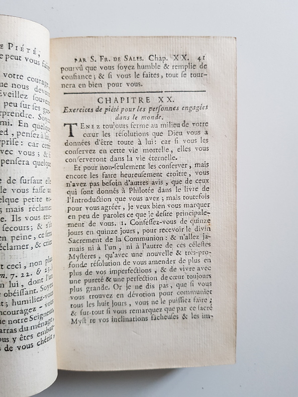 Bon exemplaire, dans une ravissante reliure en bon état, d'une édition “des plus beaux endroits des Epîtres & des Entretiens spirituels” de Saint François de Sales, réunie par le Père Collot. La première édition de cet ouvrage parut en 1728, bientôt suivie de nombreuses réimpressions. Barbier IV/1110e.