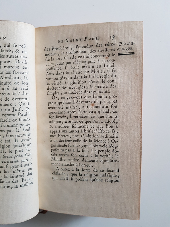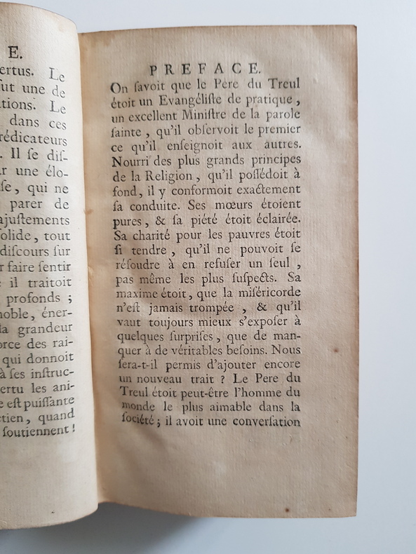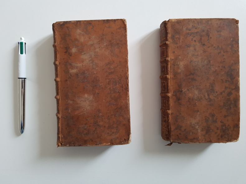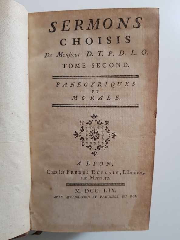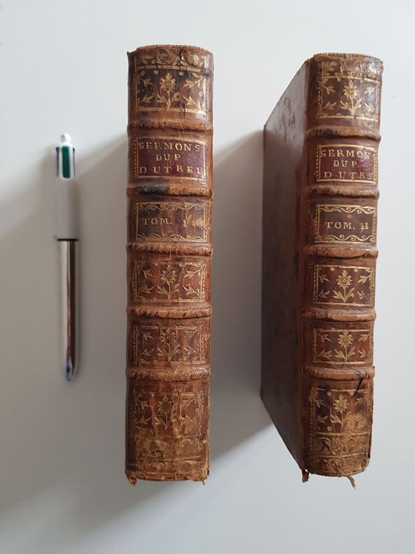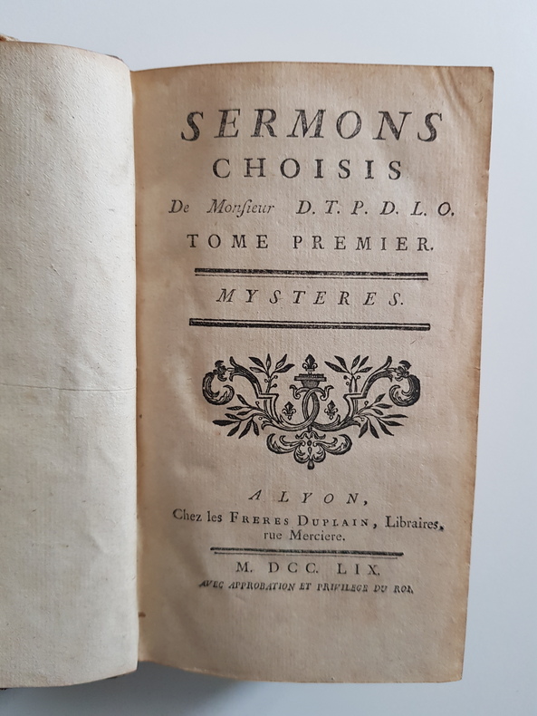 Titre : Sermons choisis. Tome I : Mystères - Tome II : Panégyriques et Morale Auteur : Du Treuil, Père Édition : Édition originale ou contemporaine de l'édition - avec approbation et privilège du Roi Lieu d'édition : Lyon Éditeur : Frères Duplain, libraires, rue Mercière Date : 1759 Langue : Français Format : 2 volumes in-12 - env. 17 x 10 cm Reliure : Plein veau marbré d'époque - dos à nerfs orné de caissons et fleurons dorés, pièces de titre rouges « Sermons du P. Du Treu(il) » - tranches mouchetées Etat du livre : Bon état général - frottements d'usage aux plats, coins émoussés, coiffes usées avec petits manques, mors en partie fendus par endroits mais reliures encore solides - intérieurs propres avec brunissures et rousseurs éparses, quelques petites taches et rares piqûres - bel exemplaire homogène Contenu : Recueil de sermons du Père du Treuil, prêtre de l'Oratoire, répartis en deux tomes distincts : I. Mystères ; II. Panégyriques et Morale Remarques : Impression lyonnaise soignée des Frères Duplain - intéressante source pour l'éloquence sacrée du XVIIIe siècle