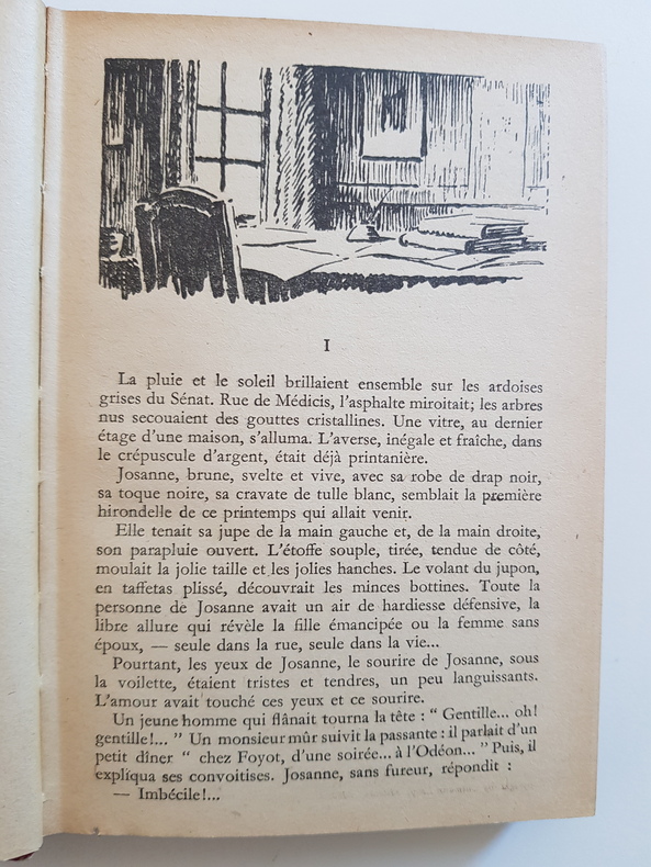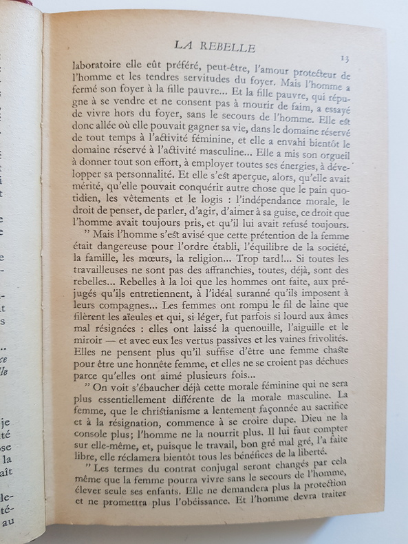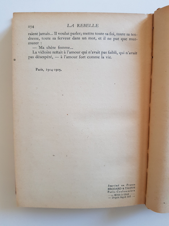 Titre : La Rebelle Auteur : Tinayre Marcelle Éditeur : Calmann-Lévy Lieu et date : Paris, copyright 1922, tirage mentionné 3-1928 Reliure : Cartonnage/toile rouge de l’éditeur, sans jaquette Format : env. 19 x 12 cm Illustrations : vignettes en noir in-texte Langue : français État : bon état d’usage - dos et coiffes légèrement frottés, coins émoussés, intérieur propre avec papier uniformément jauni, charnières solides Particularités : mention d’impression en fin de volume « Imprimé en France - Brodard & Taupin - Paris-Coulommiers - 6766-3-1928 - Dépôt légal 107 » Résumé : Roman de moeurs de la Belle Époque, La Rebelle suit le parcours d’une jeune femme décidée à vivre librement et à s’affranchir des attentes sociales et conjugales. Tinayre y déploie un portrait sensible et volontiers féministe de la condition féminine, entre indépendance, amour et contraintes du temps.