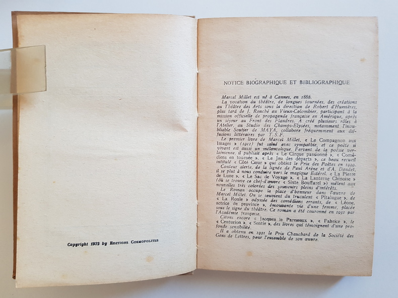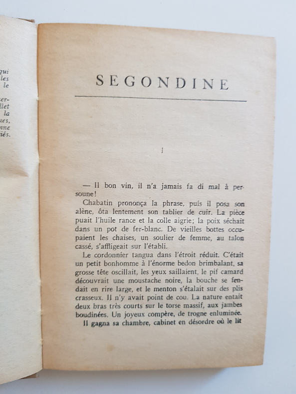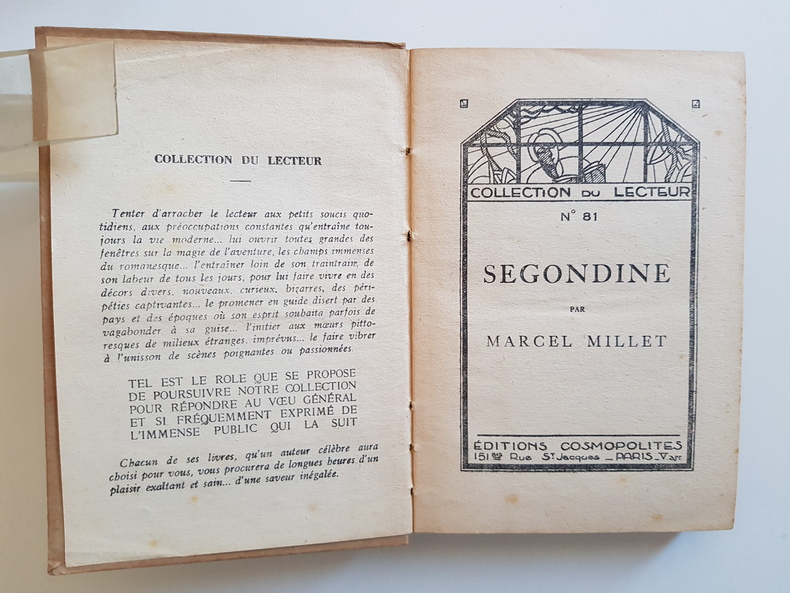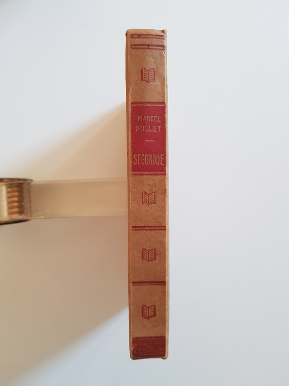 tre : Segondine Auteur : Millet Marcel Éditeur : Éditions Cosmopolites Collection : Collection du Lecteur - n° 81 Lieu et date : Paris, 1932 Format : in-12, env. 17 x 12 cm Reliure : Cartonnage éditeur bradel, demi-papier à coins et bandes imprimé façon marbré rouge sur fond chamois, dos lisse imprimé en rouge (petits fers « livre »), tranchefile simple. État : Bon état d’ensemble - dos légèrement passé avec infimes frottements aux coiffes, coins un peu émoussés, plats propres avec très légère usure, papier uniformément jauni avec Quelques rousseurs éparses. Coutures solides, sans annotations visibles. Langue : Français Particularités : Copyright 1932 par les Éditions Cosmopolites. Adresse à la page de titre : 151 bis, rue Saint-Jacques - Paris Ve. Notice biographique et bibliographique de l’auteur en ouverture.