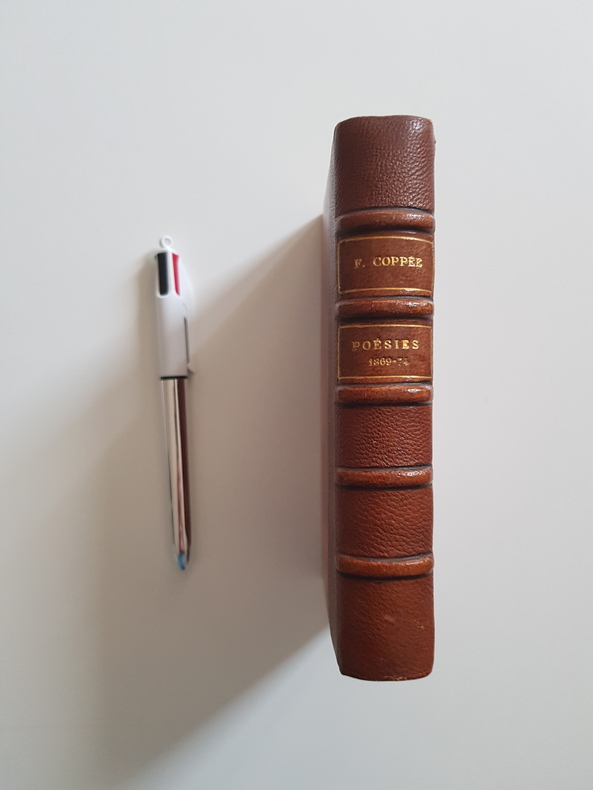 Auteur : Coppée François Titre : Oeuvres - Poésies 1869-1874 Éditeur : Alphonse Lemerre, éditeur Lieu : Paris Date : s.d. (fin XIXe) Collection : Oeuvres de François Coppée Reliure : Demi-maroquin brun, dos à 5 nerfs orné de filets et titres dorés, plats de papier marbré rouge nuagé, tranchefile, reliure solide Format : In-12 Langue : Français État : Bon exemplaire. Légers frottements d'usage aux coiffes et aux coins, dos très propre, intérieur frais avec papier uniformément jauni, rares rousseurs éparses Description : Page de titre imprimée en rouge et noir avec la vignette de l'éditeur. Contenu annoncé au titre : Les Humbles - Écrit pendant le siège - Plus de sang - Promenades et Intérieurs - Le Cahier rouge. Mention d'impression au dernier feuillet : « Paris. - Imp. A. Lemerre, 6, rue des Bergers. » Remarques : Agréable exemplaire des poésies de 1869-1874, dans une élégante reliure en demi-maroquin