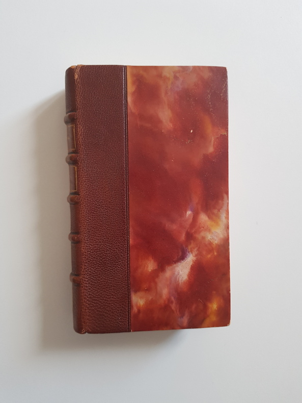 1890 4 volumes, reliure demi-chagrin havane (binding half shagreen) in-douze (duodecimo), dos 4 nerfs (spine with raised bands) - entre-nerfs à fleuron (floweret) - titre frappé or (gilt title), papier marbré aux plats (cover with marbled paper), tête jaspée (marbled top edge) gouttière rognée (fore-edge smoothe), marque-page en tissu vert (bookmark in tissue), illustrations : bandeaux (headpiece) + lettrines (dropped initial) + culs-de-lampe (tailpiece), 204+236+283+224 pages, les années 1880 à Paris Alphonse Lemerre Editeur,