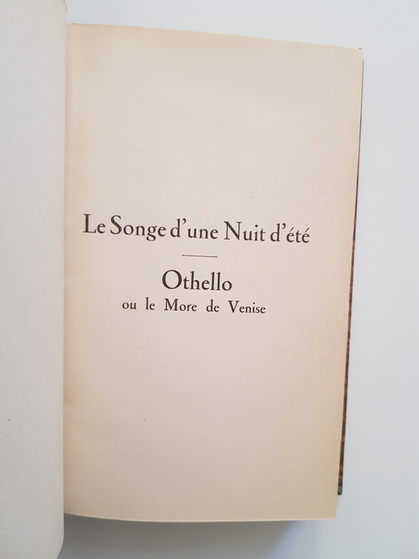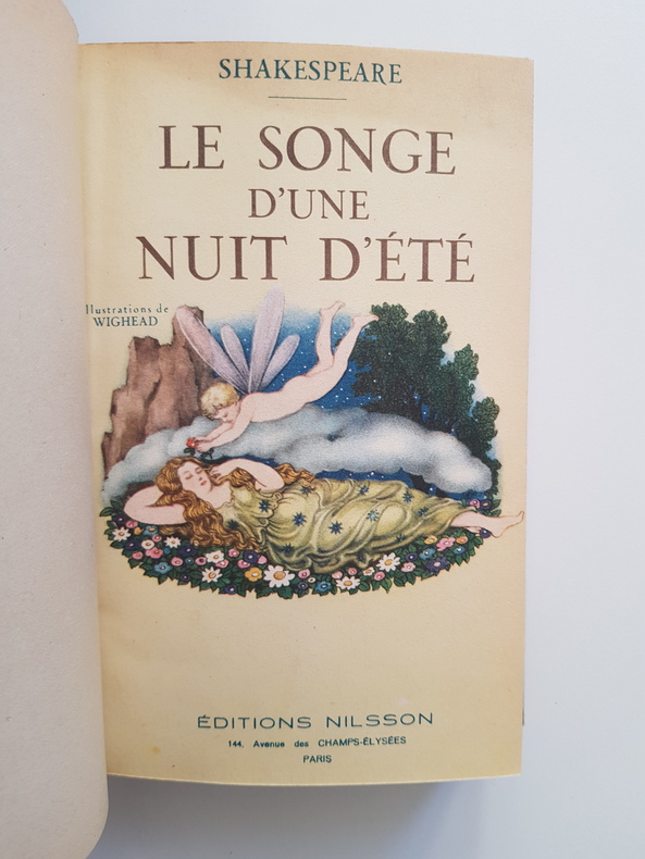 Titre : Le Songe d'une Nuit d'Été - Othello ou le More de Venise Auteur : Shakespeare, William Illustrateur : Wighead Éditeur : Éditions Nilsson Lieu : Paris Langue : Français Reliure : Demi-basane brune, dos à nerfs orné de fers et filets dorés, titre et auteur dorés, plats de papier marbré Format : In-8 env. (≈ 20 x 13 cm) État : Très bon état ; légers frottements aux coiffes et aux mors, infimes marques d'usage, intérieur propre, papier uniformément jauni, rares rousseurs éparses ; reliure solide et décorative Illustrations : Titre illustré en couleurs et planches en couleurs hors texte par Wighead Contenu : Deux pièces de Shakespeare en un volume en traduction française non mentionnée