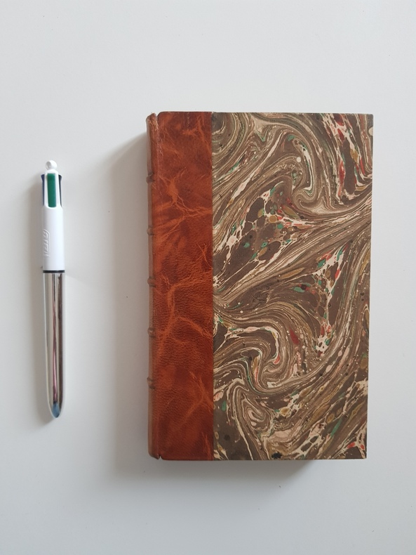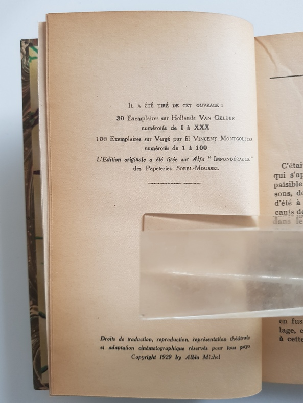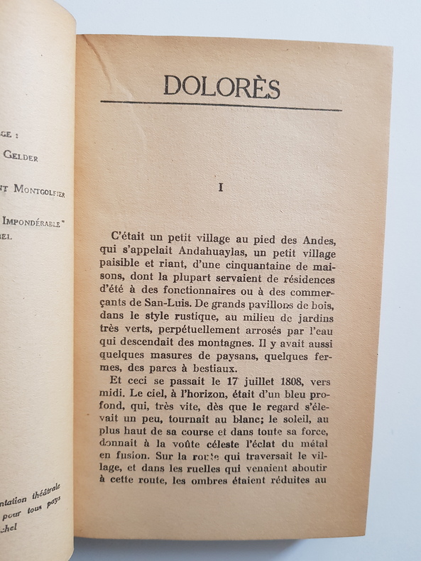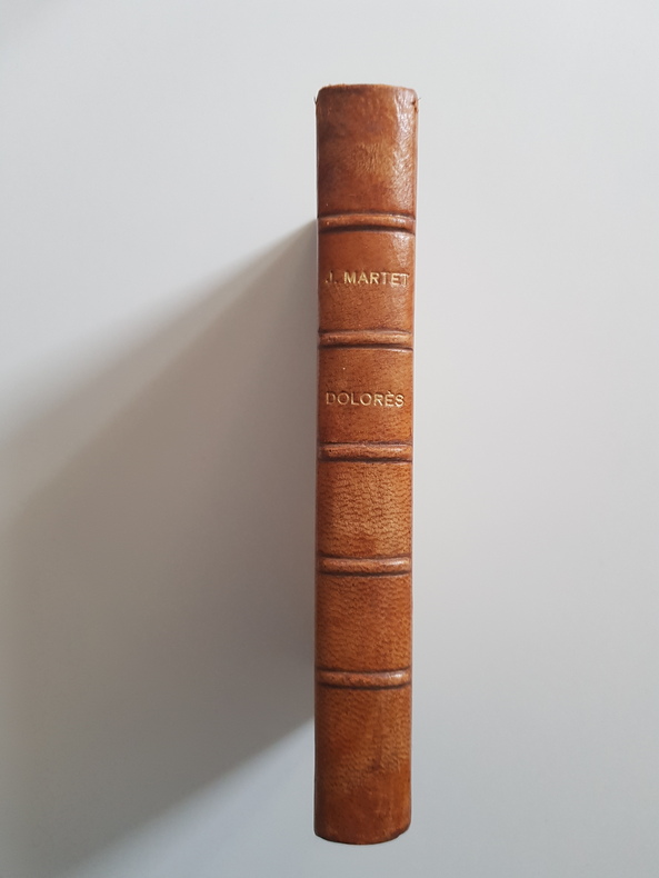 Titre : Dolorès Auteur : Martet Jean Éditeur : Albin Michel, éditeur Lieu : Paris Date : 1929 Collection : Roman Reliure : Demi-basane brun fauve, dos à 5 nerfs avec titre doré, plats de papier marbré tourbillonnant, reliure soignée et solide Format : In-12 Langue : Français État : Bon exemplaire. Frottements d'usage aux mors et aux coiffes, coins légèrement émoussés, intérieur propre au papier uniformément jauni, rares rousseurs Description : Page de titre au monogramme AM. Justification du tirage présente : 30 exemplaires sur Hollande Van Gelder numérotés I à XXX, 100 exemplaires sur Vergé pur fil Vincent Montgolfier numérotés 1 à 100. Mention « L'édition originale a été tirée sur Alfa ‘Impondérable' des Papeteries Sorel-Moussel ». Copyright 1929 by Albin Michel. Roman se déroulant au pied des Andes Remarques : Édition originale, tirage courant sur Alfa, en élégante reliure de l'époque