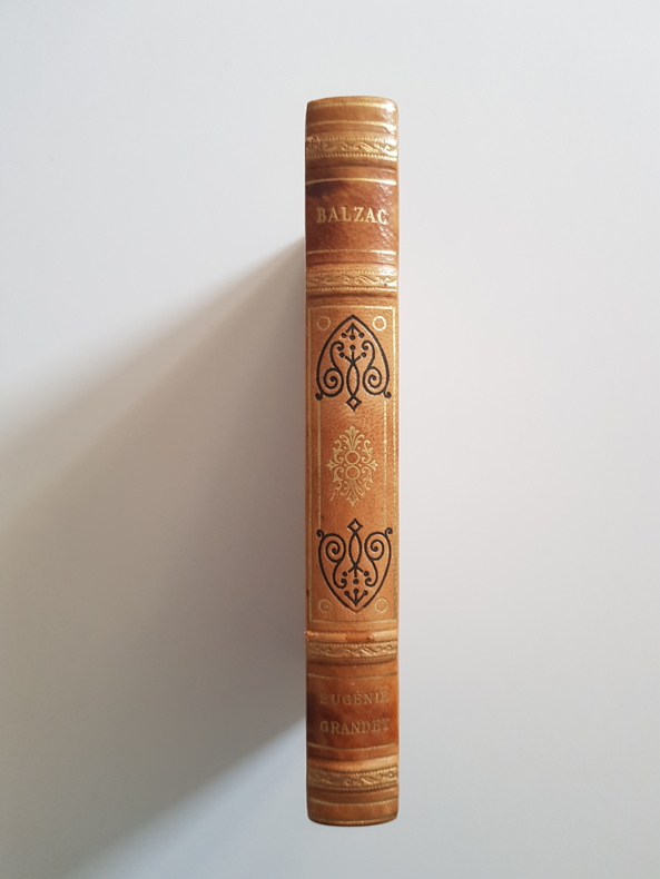 Précieuse édition originale d’ « Eugénie Grandet », chef-d’œuvre balzacien, conservée dans l’une des rarissimes reliures de l’époque non tomées spécialement réalisée à Paris pour cette œuvre remarquable. Carteret, I, 69 ; Vicaire, I, 197. Ce volume « contient : ‘Eugénie Grandet’ (inédit). C’est l’édition originale de ce roman » (Vicaire). L’édition originale d’« Eugénie Grandet », l’une des plus recherchées de l’œuvre balzacienne, se trouve généralement insérée dans les douze volumes tomés des « Études de Mœurs au XIXe siècle » et les bibliographes attirent notre attention sur le fait que, vendu isolément, l’on a généralement masqué la tomaison du volume sous un fleuron moderne. M. Clouzot (p. 21) écrit notamment : « Eugénie Grandet se vend souvent séparément. Ce volume en reliure d’époque porte en principe un numéro de tomaison au dos, chiffre souvent dissimulé sous un fleuron moderne. Se méfier. » D’où l’intérêt majeur de cet exemplaire relié séparément dès l’origine sans mention de tomaison. Eugénie Grandet publié vers la fin de 1833 est le premier des grands livres de Balzac. Quelques-uns disent son chef-d’œuvre. Dans la ville de Saumur, le terrible père Grandet, ex-tonnelier, a réuni grâce à une série d’heureuses spéculations une fortune qu’il augmente avec une héroïque et atroce avarice. Le lecteur est transporté au sein de la famille, qui comprend la fidèle servante Nanon, l’épouse de Grandet, femme sans volonté, et la fille de Grandet, la jeune Eugénie, un être d’une lumineuse beauté à l’âme noble et délicate, autour de laquelle se combattent les cupidités et les intrigues des deux grandes familles bourgeoises de la ville, les Cruchot et les Des Grassins, qui espèrent s’unir par un mariage à la très riche héritière. Le soir même de l’anniversaire d’Eugénie, occasion d’une petite fête chez les Grandet, arrive à l’improviste Charles Grandet, jeune Parisien élevé dans le luxe et l’oisiveté, fils d’un frère du vieux Grandet qui, à la suite d’une faillite de quatre millions, s’est fait sauter la cervelle. Le vieil avare apprend la mort de son frère par une lettre qui le prie de prendre soin de la liquidation et de fournir à son fils des moyens d’aller tenter fortune aux Indes. Durant les quelques jours que passe dans la maison ce jeune homme bouleversé par le malheur prend naissance chez Eugénie une profonde passion pour son cousin, un véritable grand amour que Charles, ému, semble partager. Puis le jeune homme part, non sans avoir prêté des serments d’éternelle fidélité. Cette première partie est la meilleure : les personnages ont un relief incomparable, les faits s’entremêlent et se développent d’une façon classique, l’amour d’Eugénie enfin est saisi avec une délicatesse qui ne fut peut-être jamais plus atteinte par Balzac. Le reste n’est que la conclusion, l’histoire d’Eugénie dépendant entièrement de ce premier épisode décisif auquel s’oppose le portrait classique de l’avare, le personnage du père, qui prend peu à peu une terrible importance. L’œuvre resplendit d’une force d’art incomparable : le personnage d’Eugénie et celui de son père sont justement considérés parmi les plus heureux de tous les portraits dus à la plume de ce créateur de génie. Le style se montre, ici, mobile, pénétrant et beaucoup moins minutieux et lourd que dans bien d’autres œuvres du même romancier ; pas de longues digressions morales qui, si elles confèrent à certaines de ses œuvres un réel intérêt, en gâtent souvent la pureté de lignes. L’un des plus beaux exemplaires répertoriés, non lavé et presque totalement dénué de rousseurs, de l’un des chefs-d’œuvre de la littérature mondiale.