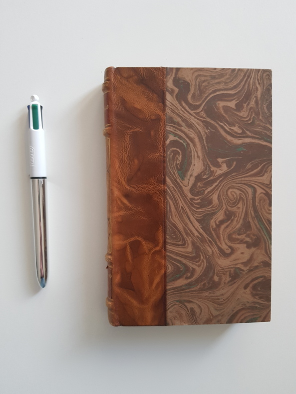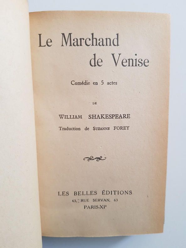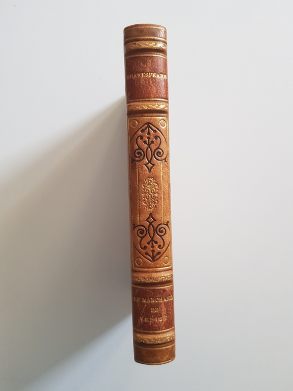 Titre : Le Marchand de Venise Auteur : Shakespeare William Éditeur : Les Belles Éditions Lieu d'édition : Paris, 63 rue Servan, XIe Date : s.d. - traduction de Suzanne Forey Reliure : Demi-basane fauve, dos à nerfs orné de filets et fleurons dorés et à froid, pièces de titre rouges dorées, plats papier marbré brun Etat du livre : Bon état - dos et mors frottés, petites épidermures, coiffes légèrement usées, coins émoussés, intérieur propre au papier uniformément jauni avec rares rousseurs, reliure solide Jaquette : Sans jaquette (éditeur) Format : in-12 env. - 18 x 12 cm Langue : Français Particularités : Comédie en 5 actes, traduction de Suzanne Forey, titre illustré en couleurs, impression des Belles Éditions Description : Bel exemplaire ancien de la pièce de Shakespeare en demi-reliure d'époque, dos richement orné et titres dorés. Exemplaire bien conservé, agréable en main.