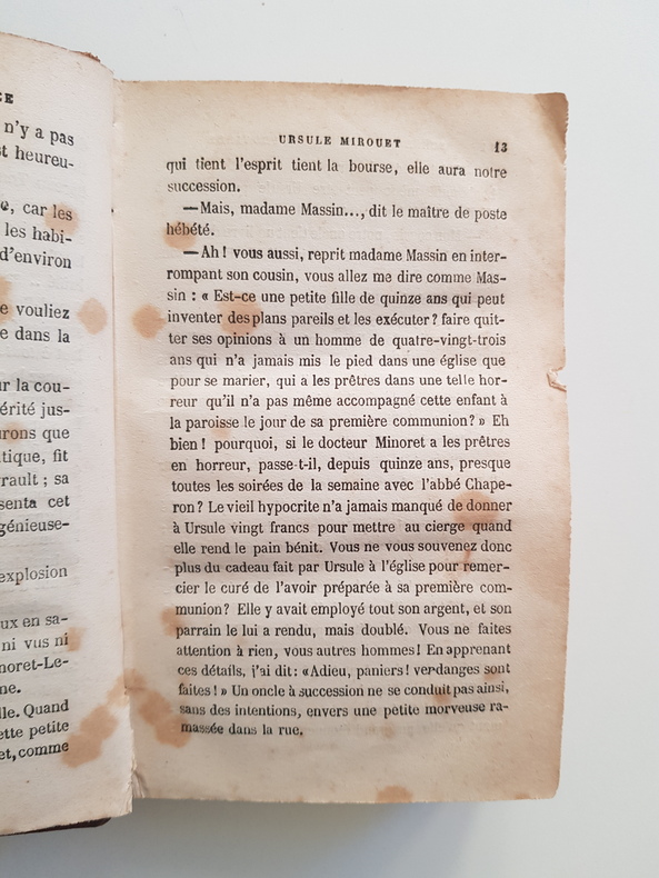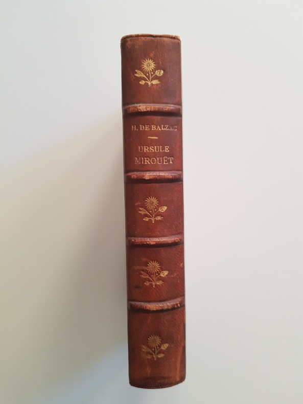 Édition originale rare. (Clouzot 30). Elle faisait défaut à la collection romantique de Maurice Escoffier. Vicaire, I, 217; Rahir, La Bibliothèque de l’amateur, 306; Catalogue Destailleur 1379. Une des œuvres-clés de Balzac, pénétrée d'occultisme. Balzac qualifiait de "privilégiée" l'histoire d'Ursule, "sœur heureuse d'Eugénie Grandet". Le roman ouvre les Scènes de la vie de province : une jeune fille parvient à triompher de la machination ourdie contre elle visant à la spolier. Ce portrait de jeune fille fut dédié par Balzac à sa nièce, Sophie Surville. La première partie d’Ursule Mirouet, « Les Héritiers alarmés », nous présente la bonne société de Nemours ou plutôt les quatre familles bourgeoises apparentées les unes aux autres qui, sous la Restauration, dominaient la petite ville. Minoret-Levrault, maître de poste, est une espèce d’Hercule stupide, dominé par sa femme, l'inquiétante Zélie; le couple vit pour son fils, Désiré, jeune dandy qui fait ses études de droit. Le docteur Minoret, ancien disciple des encyclopédistes et athée convaincu, a fait retour à sa ville d'origine, où il achève dans la retraite sa brillante carrière d'ex-médecin de l'Empereur. Le docteur n'a pas d'enfant, et ses neveux, dont le maître de poste, pensent qu'ils se partageront son héritage. Mais Minoret amène dans sa maison une orpheline, Ursule Mirouet, fille d'un chanteur, lui-même enfant naturel d'un organiste. Ursule est sa nièce et il l'élève comme sa fille, dirigeant lui-même son instruction avec l'aide de ses vieux amis, le curé Chaperon, le juge de paix Bongrand et le vieil officier de Jordy. En grandissant, la petite Ursule s'aperçoit que son oncle et parrain, ne partage pas sa foi, elle en éprouve une vive douleur. Le vieux docteur, brouillé depuis longtemps avec un ancien camarade qui s'est lancé dans l'étude du magnétisme, reçoit soudain de ses nouvelles. Son ami lui demande de le revoir à Paris. Minoret se rend au rendez-vous et assiste à une séance d'expériences magnétiques au cours de laquelle une voyante lui expose, point par point, les menus gestes de sa filleule restée à Nemours. De retour dans sa maison, le docteur constate que les dires de la voyante étaient scrupuleusement exacts. Ébranlé dans ses convictions, ému par la souffrance que cause à Ursule devenue une jeune fille son impiété, le vieil athée se convertit brusquement. Cet événement imprévu sème le trouble parmi les héritiers : Minoret ne va‑t‑il pas laisser ses biens à l’Église, pis encore, faire de sa filleule héritière ? Aussi entoure-t-on le vieillard de manœuvres et de suspicion. Mais le docteur est bien davantage troublé par une découverte qu'il vient de faire ; Ursule est amoureuse d’un jeune voisin, Savinien de Portenduère. Peu après, le jeune homme est mis en prison pour dettes; sa mère, veuve et pauvre, ne peut rien pour lui, et c'est le docteur Minoret qui avance l'argent nécessaire à sa libération; il va lui-même le tirer de prison. C’est au tour de Savinien de tomber amoureux de la belle Ursule. L'indulgent docteur Minoret est prêt à donner son consentement à cette union, si Savinien rachète sa conduite passée ; mais la fière Mme de Portenduère reste intraitable, son fils n'épousera pas une orpheline, fille d'un « capitaine de musique », lui-même fils naturel. Aussi Savinien quitte-t-il Ursule pour s'engager dans la marine lors de la conquête de l'Algérie. Il en revient gradé et glorieux, toutefois sa mère ne veut pas céder. Devant cette attitude, le docteur se voit obligé de fermer sa porte à Savinien. Cette première partie n'est que le prélude du drame qui s'ouvre avec la mort du docteur (IIè partie, « La Succession Minoret »). Les dispositions du vieillard avaient été prises, il avait dissimulé des titres au porteur pour sa filleule, laissant à ses héritiers légaux leur part normale d'héritage. Sur son lit de mort, le docteur remet à Ursule la clé qui ouvre le cabinet où se trouve caché l'argent qu'il lui destine ; mais la jeune fille, troublée, se laisse distancer par un des héritiers, le maître de poste Minoret-Levrault, lequel, dissimulé près de la chambre mortuaire, a tout entendu. Minoret-Levrault s'empare du magot et tout le monde s'étonne qu’Ursule n'ait reçu qu'une somme insignifiante. La jeune fille, en butte à la persécution des héritiers, se retire dans une petite maison avec une servante ; tout espoir d'épouser Savinien de Portenduère est maintenant perdu pour elle. Mais la présence d'Ursule dans la ville gêne Minoret-Levrault, qui n'a avoué à personne, pas même à sa femme, son larcin. Il demande à l'ignoble Goupil, clerc de notaire satanique et repoussant, de l'aider à chasser la jeune fille. Celui-ci commence alors une campagne de lettres anonymes qui fait planer la terreur sur la pauvre fille et la conduit bien près de la mort. Mais comme Minoret-Levrault qui s'est constitué une immense fortune ne paie pas suffisamment les services rendus par Goupil, celui-ci décide de se venger. Il avoue être l’auteur de la machination mais il n'a été qu'un instrument entre les mains de Minoret-Levrault. Les vieux amis du docteur, qui continuent à protéger Ursule et Savinien, demeuré fidèle, se demandent quelle raison a pu pousser Minoret-Levrault à vouloir à tout prix le départ d’Ursule. Celle-ci revoit son oncle en rêve, et le mort lui dévoile dans tous ses détails l'infamie de Minoret-Levrault. De présomption en présomption, on parvient à découvrir le vol. Le fils ainé de Minoret-Levrault meurt dans un accident qui avait été annoncé par le défunt à sa filleule; sa femme devient folle, quant à lui, durement éprouvé, il devient un vieillard blafard et dévot qui s'efforce de racheter son acte. Ursule épousera enfin Savinien et ils vivront dans le château acquis par le maitre de poste que celui-ci leur a abandonné. 