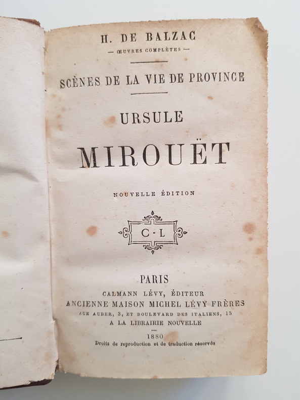 Titre : Ursule Mirouët Auteur : Balzac, Honoré de Collection/Série : Oeuvres complètes - Scènes de la vie de province (Nouvelle édition) Éditeur : Calmann Lévy, ancienne maison Michel Lévy Frères Lieu d'édition : Paris Date d'édition : 1880 Langue : Français Reliure : Demi-basane brune, dos à nerfs orné de fleurons dorés et titre doré, plats papier marbré Format : In-12 Dimensions : environ 18 x 12 cm État du livre : Reliure solide. Frottements et petites épidermures au dos et aux mors, coiffes et coins émoussés. Plats marbrés frottés. Intérieur complet, papier bruni avec rousseurs éparses et taches anciennes plus marquées en début et fin de volume, petites usures marginales sans manque à quelques feuillets. Exemplaire de lecture propre et bien relié. Description : Édition de 1880 de l'un des romans majeurs de la Comédie humaine, dans la série Scènes de la vie de province. Page de titre portant la mention « Nouvelle édition ». Adresse de l'éditeur lisible sur la page de titre : « Auber, 3, et boulevard des Italiens, 15 - À la Librairie Nouvelle ».