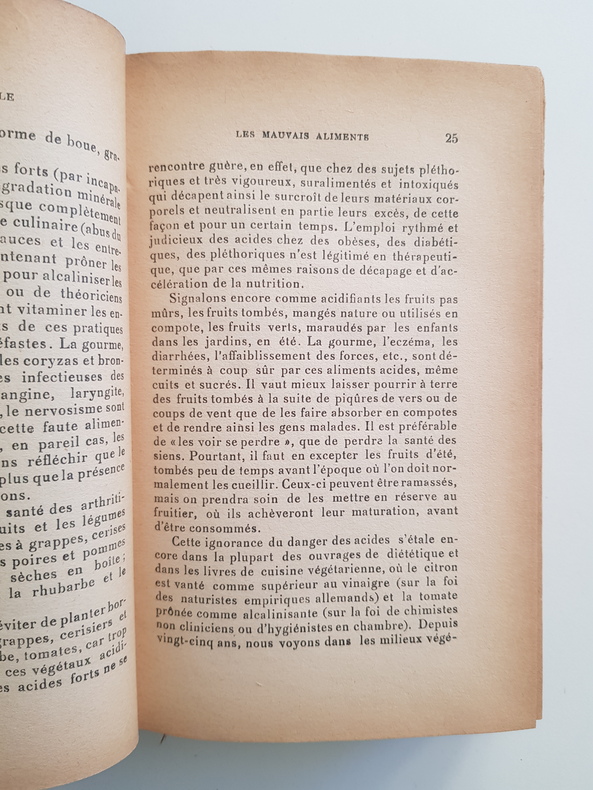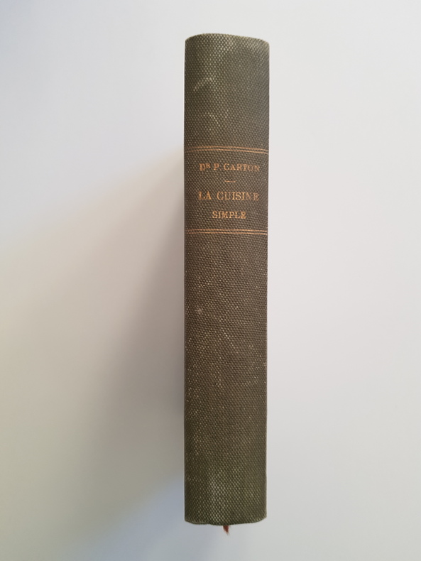 Titre : La cuisine simple Auteur : Carton, Paul Éditeur : Maloine & Fils Lieu d'édition : Paris Date d'édition : s.d. Langue : Français Reliure : Cartonnage toilé vert, dos lisse avec filets et titre dorés, signet rouge Dimensions : environ 19 x 13 cm État du livre : Solide exemplaire. Légers frottements et petites taches sur la toile, coins émoussés. Intérieur uniformément bruni, rousseurs éparses et minimes usures marginales sans manque. Bon exemplaire de lecture. Description : Ouvrage emblématique du Dr Paul Carton consacré à l'hygiène alimentaire et à la cuisine saine. Édition Maloine & Fils, sans date. Page de titre décorative imprimée en rouge (chaudron au feu devant une cheminée). Chapitres sur l'alimentation saine et les mauvais aliments, fondements de la diététique naturiste de Carton.