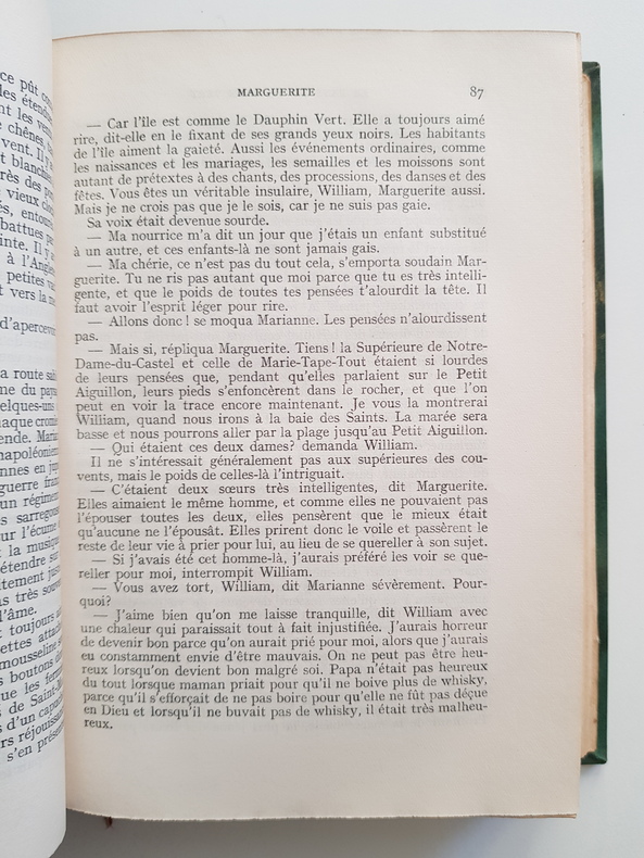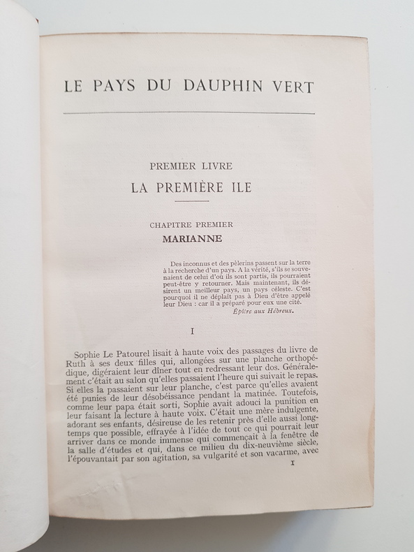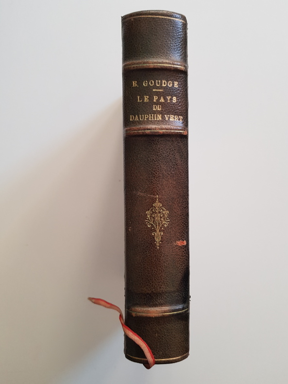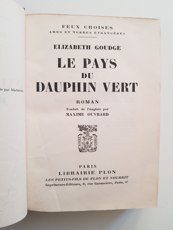 Titre : Le Pays du Dauphin Vert Auteur : Goudge Elizabeth Traducteur : Ouvrard Maxime Éditeur : Librairie Plon - Les Petits-Fils de Plon et Nourrit, imprimeurs-éditeurs Collection : Feux Croisés - Âmes et terres étrangères Lieu : Paris Date : s.d. Langue : français Reliure : Demi-chagrin brun, dos à nerfs orné de filets et fleurons dorés, titre doré, plats de papier marbré vert, signet de soie rouge conservé Format : env. 19 x 12 cm État : Bon état d’usage - frottements au dos et aux coiffes, petites usures aux coins, mors solides, plats marbrés avec taches et traces d’usage, papier uniformément jauni avec rares rousseurs, quelques plis marginaux. Intérieur propre et bien lisible Note : Traduction française du roman Green Dolphin Country