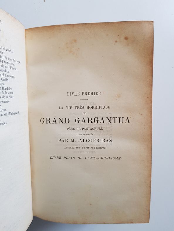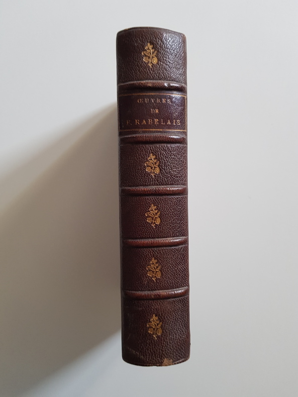 Paris P.-L. JACOB 1854 1 Augmentées de plusieurs fragments et de deux chapitres du Ve livre restitués d'après un manuscrit de la Bibliothèque Impériale. Précédées d'une notice historique sur la vie et les ouvrages de Rabelais (...) par P.-L. JACOB. Nouvelle édition, revue sur les meilleurs textes et particulièrement sur les travaux de J. LE DUCHAT et de S. de L'AULNAYE. Eclaircie quant à l'orthographe et à la ponctuation, et accompagnée de notes succintes et d'un glossaire par Louis BARRE. Ill. de Gustave DORE. P., Bry, 1854, in-4, demi-chag. havane, dos orné, triple filets dor. encadrant les plats, 340 pp.