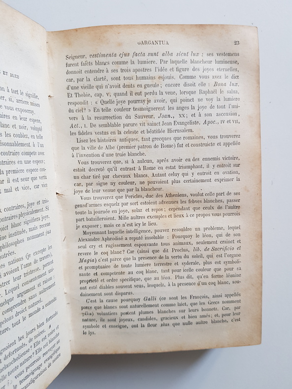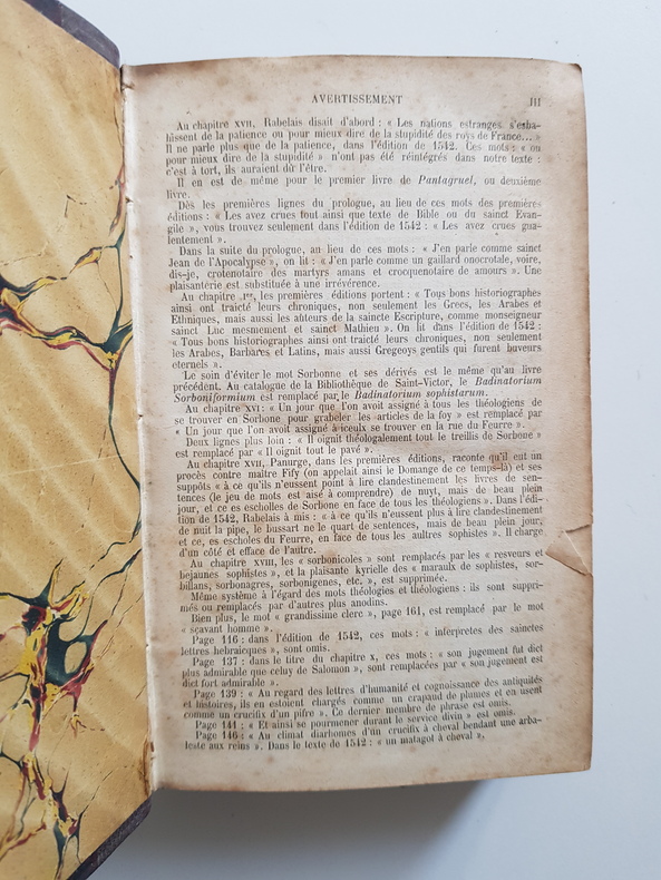 Titre : Gargantua (Oeuvres de F. Rabelais) Auteur : Rabelais François Éditeur : s.n. Lieu : s.l. Date : s.d. Langue : Français Reliure : Demi-cuir brun à dos à nerfs, titre et fleurons dorés, plats de papier marbré rouge-noir, gardes marbrées État du livre : Bon état d'usage. Frottements et rayures aux plats, coins émoussés, coiffe inférieure usée avec petit manque, mors solides. Intérieur avec rousseurs marquées et brunissures, quelques petites déchirures en marge sans manque de texte. Par contre, manque pages de titre car le livre commence à : Avertissement, page III. Description : Volume des Oeuvres de Rabelais contenant le Livre premier intitulé ‘La vie très horrificque du Grand Gargantua, père de Pantagruel', attribué à M. Alcofribas. Impression ancienne, typographie serrée, pages encadrées de filets. Jolie reliure d'époque en demi-cuir avec décor de fleurons dorés au dos. Format : In-12