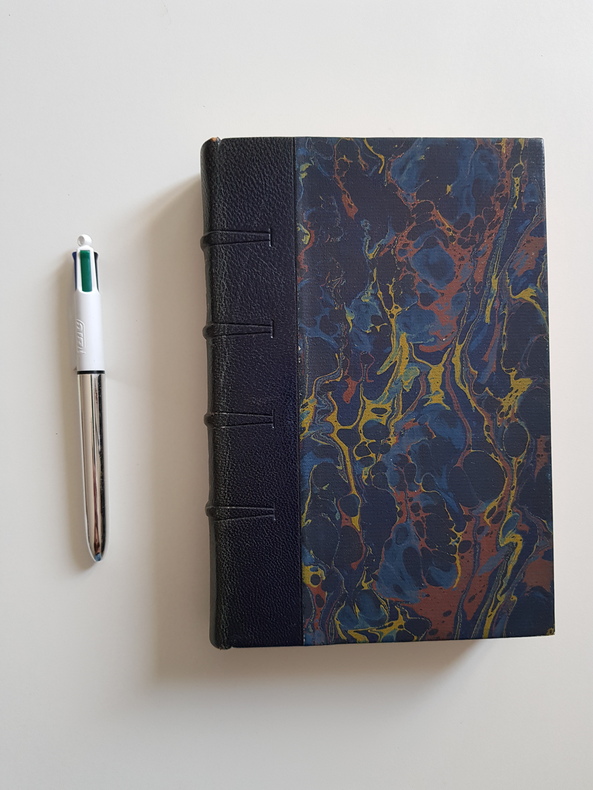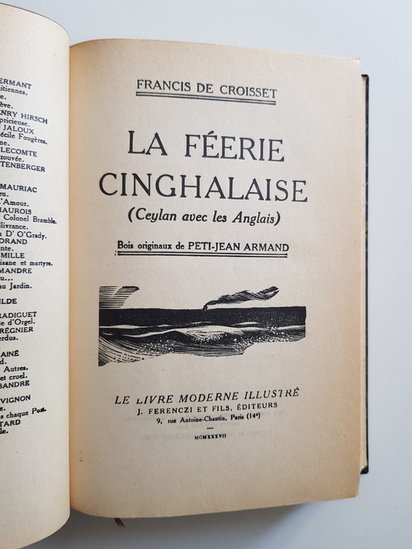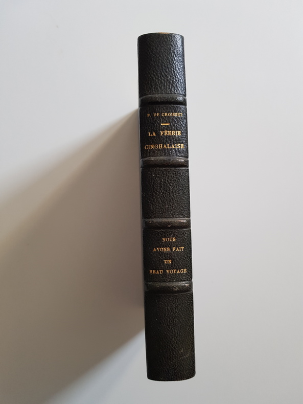 Titre : La Féerie cinghalaise - Ceylan avec les Anglais Auteur : de Croisset Francis Illustrations : Bois originaux de Peti-Jean Armand Éditeur : J. Ferenczi et Fils Collection : Le Livre Moderne Illustré Lieu : Paris Date : 1937 Langue : français Reliure : Demi-chagrin noir à dos à nerfs, titres dorés, plats de papier marbré bleu-rouge-jaune Format : env. 18 x 12 cm État : Bon état d'usage - frottements légers aux coiffes et aux mors, coins émoussés, papier uniformément jauni, quelques petites rousseurs ponctuelles, intérieur propre et solide Note : Édition ornée de bois gravés dans le texte. Le dos porte en queue la mention ‘Nous avons fait un beau voyage', propre à la présentation de cette parution dans la collection