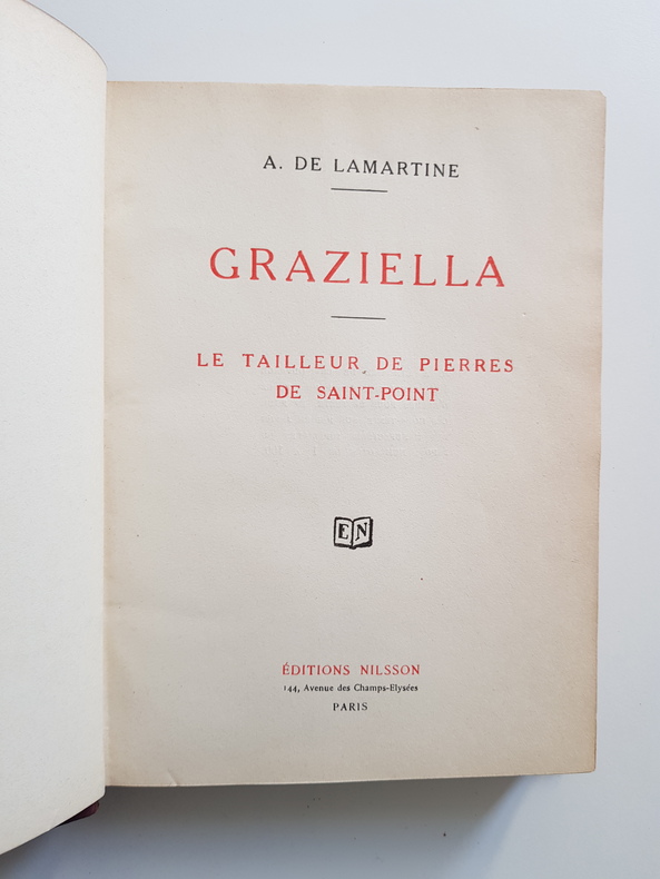 Titre : Graziella - Le tailleur de pierres de Saint-Point Auteur : Lamartine Alphonse de Illustrateur : Berty Maurice Éditeur : Éditions Nilsson Lieu d'édition : Paris Date d'édition : s.d. Langue : français Reliure : Demi-chagrin bordeaux à coins, dos à nerfs orné de filets dorés, titres dorés, plats recouverts d'un papier marbré rouge-violet Volume : Volume unique Format : in-8 env. 22 x 17 cm État du livre : Bon état d'usage. Frottements aux mors, aux nerfs et aux coins, coiffes émoussées. Intérieur propre dans l'ensemble, papier jauni. Planches en couleurs bien fraîches ; premier hors-texte protégé par un feuillet transparent avec ancienne bande adhésive en bord. Solide exemplaire. Jaquette : sans jaquette Particularités : Édition illustrée d'aquarelles de Maurice Berty, plusieurs hors-texte en couleurs, frontispice en couleurs. Mention de tirage limité à 100 exemplaires sur Arches (texte) et Japon (hors-texte) portée au justificatif de tirage.