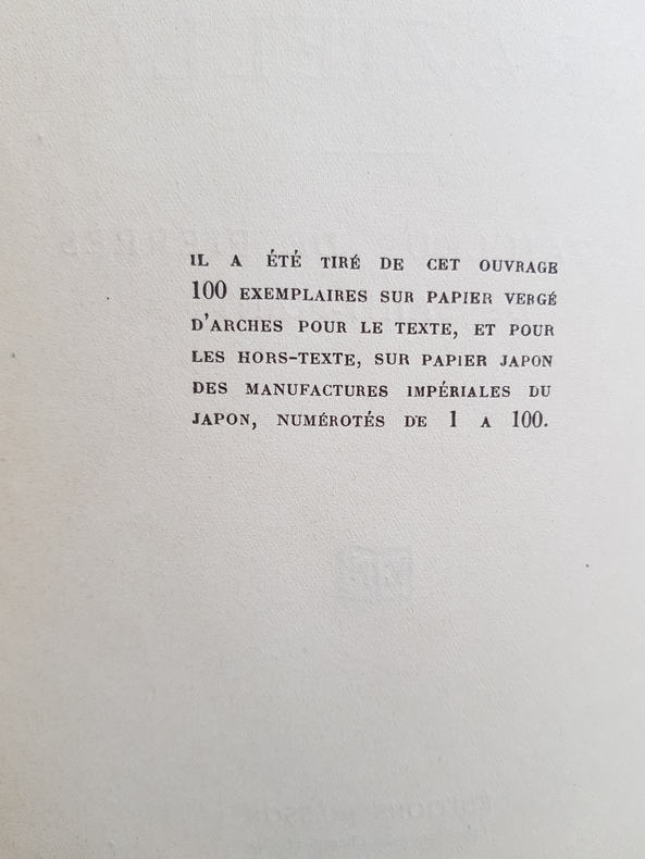 Trois volumes grand in-8 (265 x 188 mm), bradel demi-toile saumon, dos lisse orné d'un fleuron, pièce de maroquin bleu, non rogné, couverture conservée (reliure d'époque). Tirage à 1351 exemplaires ; un des 100 sur Chine de format in-8 jésus (N° 61). (quelques défauts, frottements sur les pièces de titre, coins usés, piqûres sur les tranches, quelques rousseurs). // Three tall octavo volumes (265 x 188 mm), bradel salmon half-cloth, smooth spine tooled with a floweret, blue morocco label, uncut, soft cover preserved (contemporary binding). Limited printing of 1351 copies ; one of the 100 on China paper size "in-8 jésus" (Nr 61). (some defects, rubbings on labels, corners used, spots on edges, some foxing).