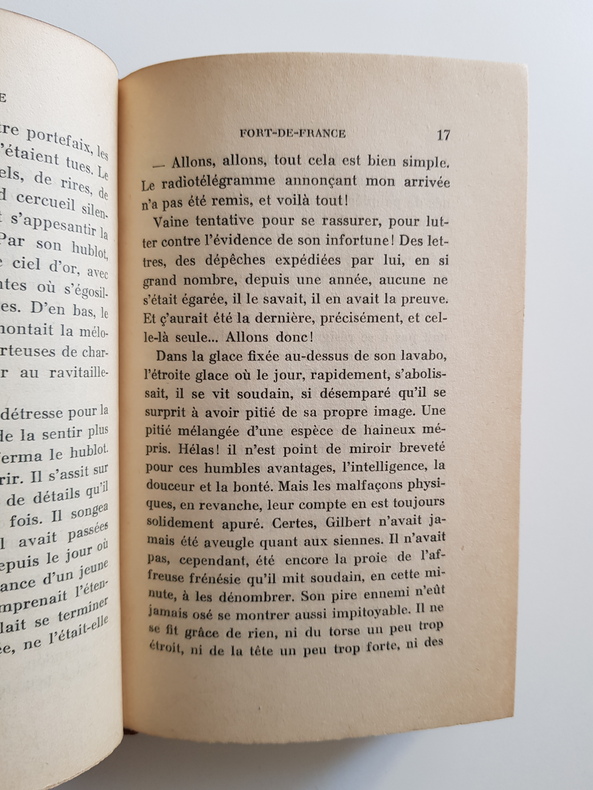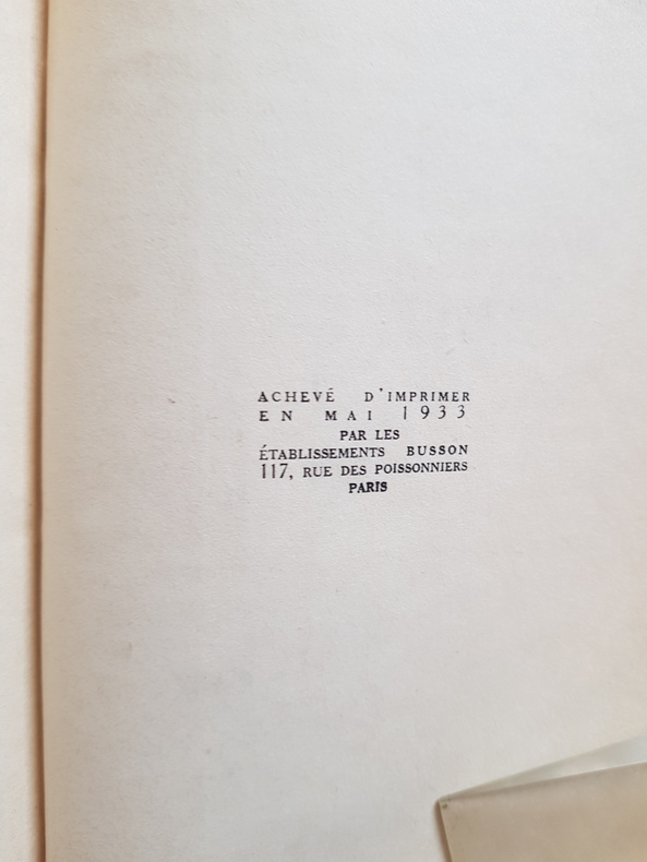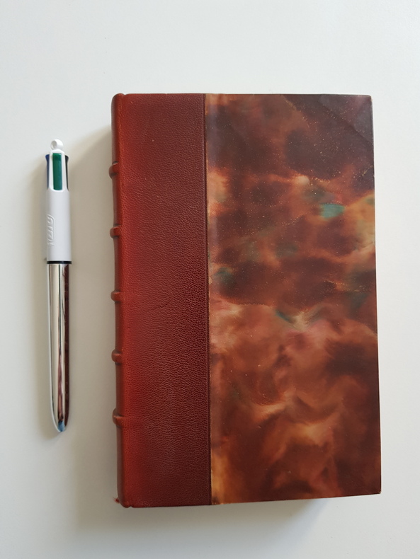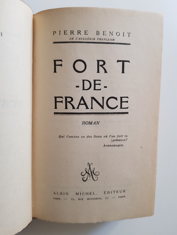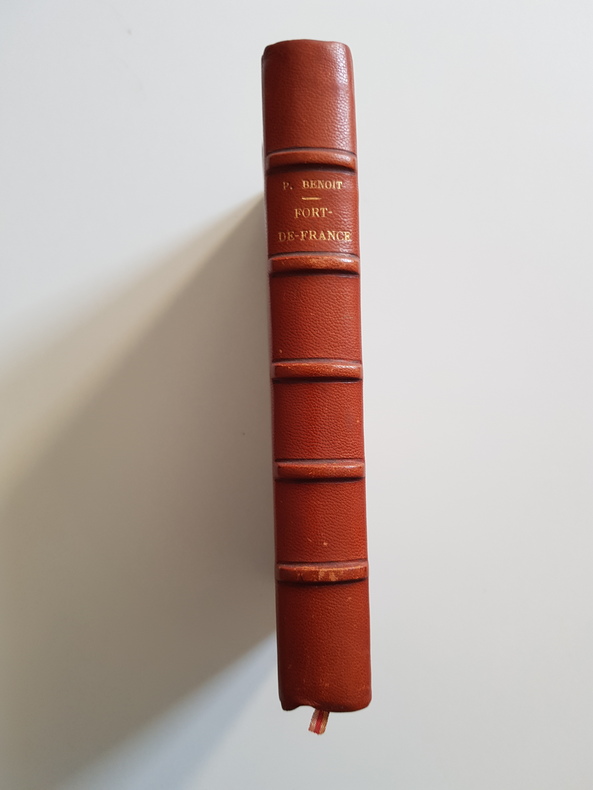 Titre : Fort-de-France Auteur : Benoit Pierre Éditeur : Albin Michel, éditeur Lieu : Paris Date : 1933 Achevé d'imprimer : Mai 1933, par les Établissements Busson, 117, rue des Poissonniers, Paris Langue : Français Reliure : Demi-cuir rouge à dos à nerfs, titre doré, ruban signet, plats de papier marbré façon écaille État du livre : Bon état d'usage. Dos et coupes avec légers frottements, petite usure aux coiffes, pli discret au coin supérieur du premier plat, intérieur uniformément jauni avec rares rousseurs, solide et propre. Sans jaquette. Description : Édition d'époque du roman de Pierre Benoit (de l'Académie française). Belle reliure artisanale en demi-cuir, dos à nerfs orné, plats marbrés. Tirage achevé d'imprimer en mai 1933 à Paris. Format : In-12
