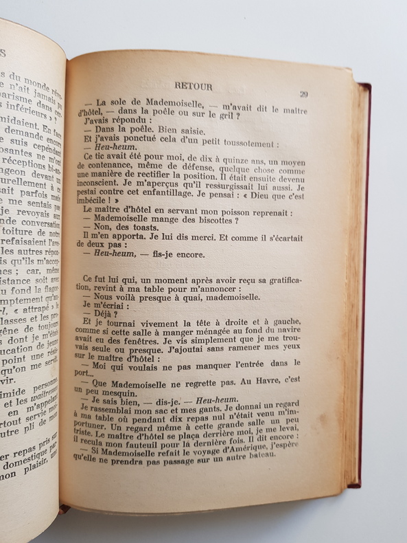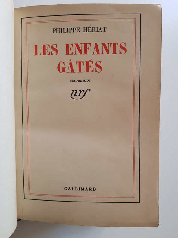 Titre : Les Enfants gâtés Auteur : Hériat Philippe Éditeur : Gallimard - NRF Lieu : Paris Date : 1940 Édition : Cent soixante et unième édition, achevé d'imprimer à l'Imprimerie Moderne, Montrouge (Seine), le 20 février 1940 Langue : Français Reliure : Élégante demi-chagrin rouge, dos lisse orné de filets dorés et titre doré « P. Hériat - Les Enfants gâtés », plats de papier marbré rouge, tête et coins très légèrement frottés, bel ensemble solide Format : In-12 environ (19 x 12 cm) État : Intérieur uniformément jauni, rares rousseurs et petites traces d'usage en marge basse de quelques feuillets, bon exemplaire propre dans une reliure soignée Particularités : Exemplaire relié, tranchefiles et filets dorés au dos Mention d'édition portée et justification d'impression de 1940