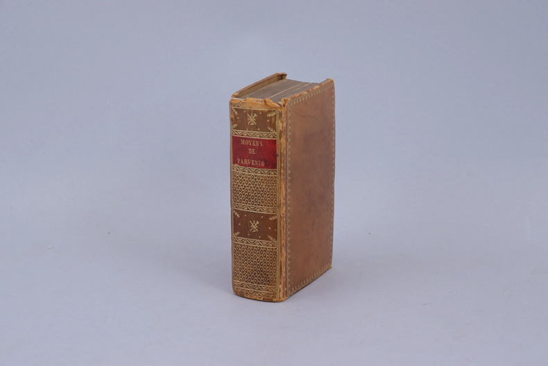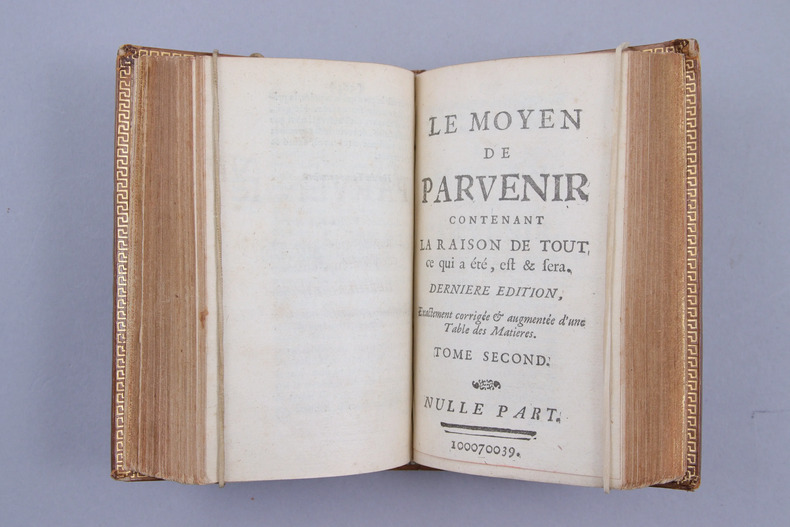 BEROALDE DE VERVILLE, François (1556-1626). Le Moyen de Parvenir, contenant la raison de tout ce qui a été, est et sera. Dernière édition, exactement corrigée et augmentée d'une Table des Matières. Tome premier (Tome second) Nulle part. 100070039. (1739) 2 tomes en 1 fort vol. in-16, (9 ff), 363 pages ; (1 f), 366 pages. Plein veau glacé fauve, roulette d'encadrement. Dos sans nerf, très orné, avec fer maçonnique. Toutes tranches dorées. Reliure établie vers 1820. (Coins un peu frottés ; coiffe supérieure élimée). . Belle impression. Un des sommets des textes facétieux, licencieux, impies, grivois, libertins, débauchés, obscènes, scatologiques du début du XVIIème siècle. L'édition originale est de 1617. Le texte fut un des grands succès de librairie pendant plus de deux siècles. Aucune de la trentaine d'éditions citées par Tchemerzine publiées aux XVII ou XVIIIème siècles ne porte une adresse typographique "sérieuse" : elles sont publiées "Cette année", "Nulle part", "A Chinon, de l'imprimerie de François Rabelais, rue du Gros Bracquemart, à la Pierre Philosophale", " A ******", "A Londres, à Parme, ou Liège" ... Beroalde de Verville, né à Paris dans une famille humaniste et protestante, se convertit au catholicisme, s'installa à Tours en 1589 et devint Chanoine de la Cathédrale Saint-Gatien. (Tchemerzine, II, page 214. Viollet le Duc ne possède pas cette édition.)