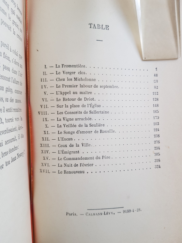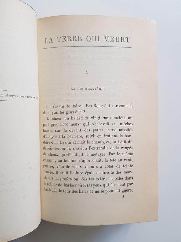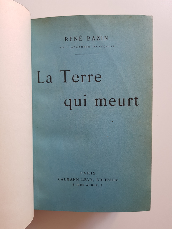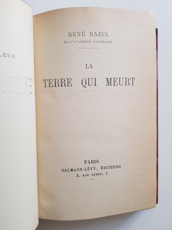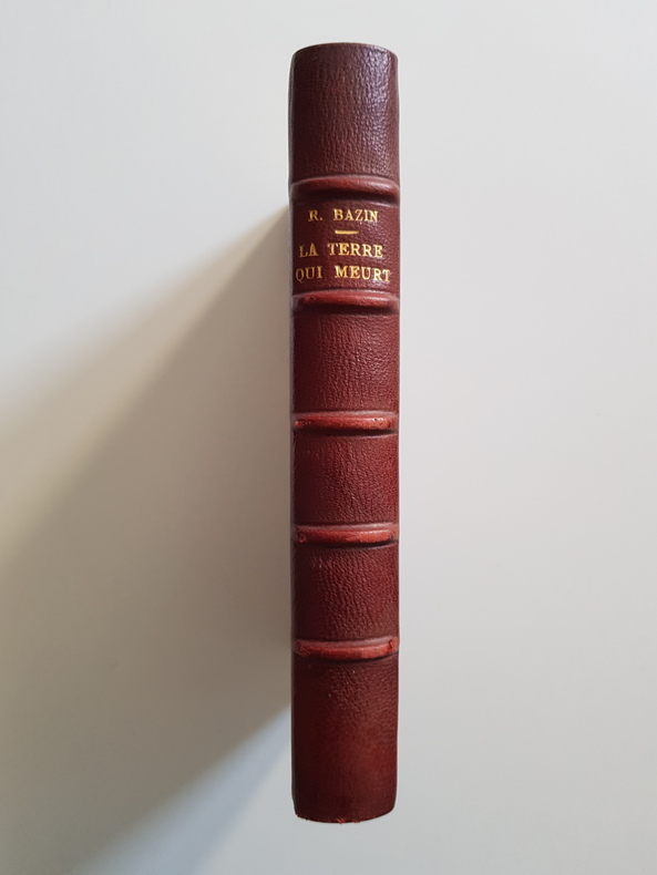 Titre : La Terre qui meurt Auteur : Bazin René Éditeur : Calmann-Lévy, Éditeurs Lieu : Paris Date : s.d. Langue : français Reliure : Demi-chagrin rouge, dos à nerfs avec titre doré, plats de papier marbré multicolore, tête teintée Format : env. 19 x 12 cm État : Bon état d'usage - frottements légers aux coiffes et aux mors, coins un peu émoussés, papier uniformément jauni avec rares rousseurs, intérieur propre et solide Note : Couverture imprimée d'origine conservée en tête. Référence d'impression Calmann-Lévy en fin de table ‘9189-4-28', suggérant un tirage des années 1920