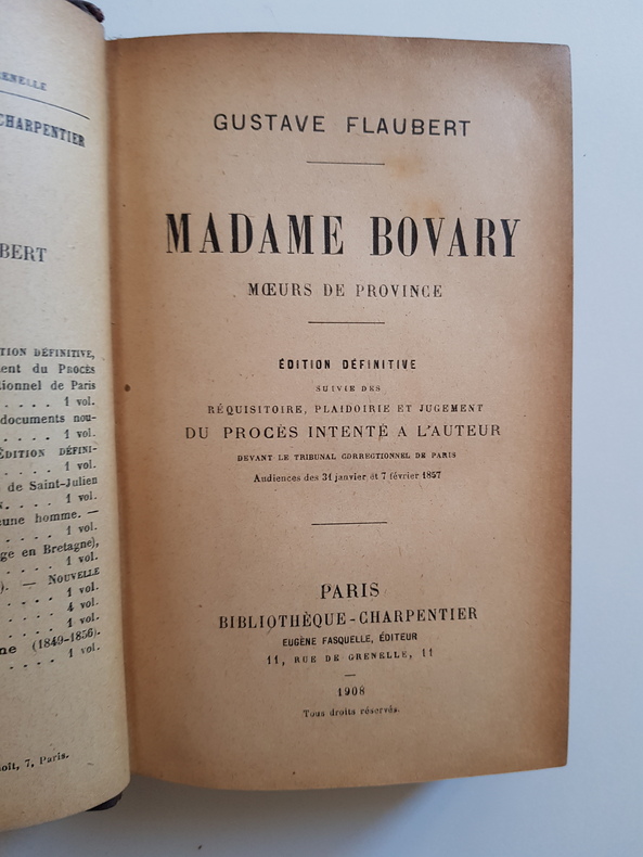 Édition définitive suivie des réquisitoires, plaidoiries et jugement du procès intenté à l'auteur devant le tribunal de Paris, audiences des 31 janvier et 7 février 1887. Volume gd in-8, relié demi cuir, 20x14cm, très bel état intérieur, 460pp, couverture conservée, très bel exemplaire. Paris, E. Fasquelle, 1928 ref/298