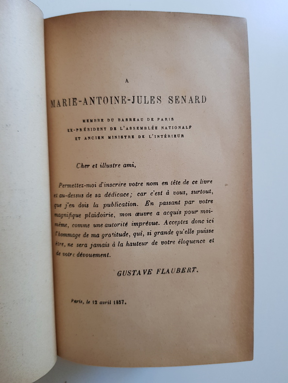 Titre : Madame Bovary - Mœurs de province Auteur : Flaubert Gustave Éditeur : Bibliothèque-Charpentier, Eugène Fasquelle Lieu et date : Paris, 1908 Édition : Édition définitive, suivie du réquisitoire, de la plaidoirie et du jugement du procès intenté à l’auteur (Tribunal correctionnel de Paris, audiences des 31 janvier et 7 février 1857) Reliure : Demi-chagrin brun d’époque, dos à 5 nerfs orné de fleurons et titre dorés, plats de papier marbré Format : env. 18 x 12 cm Langue : Français État du livre : Bon exemplaire solide. Frottements et petites épidermures au dos et aux coiffes, coins émoussés. Intérieur uniformément jauni avec rousseurs éparses, tache ancienne en tête de la page de titre. Dédicace imprimée « À Marie-Antoine-Jules Senard » conservée. Contenu : Texte intégral de Madame Bovary suivi du dossier judiciaire complet (réquisitoire, plaidoirie et jugement). Provenance : Sans mention particulière Remarque : Bel exemplaire en reliure de qualité, typique des tirages Bibliothèque-Charpentier du début du XXe siècle.