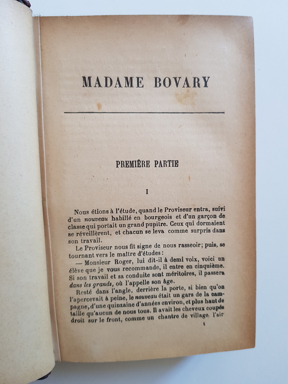 2 volumes in-16 (15,5 x 9 cm), demi basane aubergine à coins (reliure de l’époque), sous étui, dos à nerfs orné, double filet doré en bordure, tranche de tête dorée, titre en rouge et noir, [6]-252-[2] ; [4]-278-[2] pages (complet). Étui frotté. État très correct. Nouvelle édition. Œuvre emblématique de la littérature française, Madame Bovary paraît en 1857, et est alors attaquée par le procureur de Paris du Second Empire pour immoralité et obscénité. L’affaire fit beaucoup de bruit, et permit à Gustave Flaubert, très vite acquitté, d’acquérir une nouvelle renommée certaine. Agréable exemplaire.