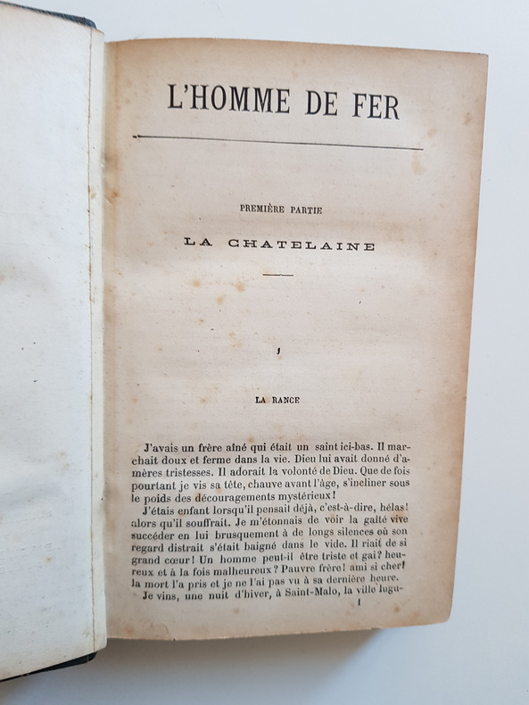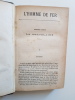 Titre : L'homme de fer Auteur : Féval Paul Éditeur : Société Générale de Librairie Catholique - V. Palmé, directeur général Lieu : Paris - Bruxelles - Genève Date : 1882 Édition : Septième édition - dans la collection des Œuvres de Paul Féval « soigneusement revues et corrigées » Reliure : Pleine basane grainée verte, dos à nerfs orné de filets dorés, pièce de titre noire, plats encadrés à froid avec grand médaillon doré central Format : In-12 - env. 18 x 12 cm Langue : Français État : Bon état d'usage - frottements aux mors, coiffes émoussées, coins arrondis, tranches et gardes brunies, rousseurs éparses ; intérieur globalement propre, reliure solide Description : Roman de Paul Féval, ici dans une édition soignée de la Société Générale de Librairie Catholique. Page de titre datée 1882, mentions d'édition et d'adresses à Paris, Bruxelles et Genève. Texte réparti en parties (« La châtelaine »), bel exemplaire en reliure d'époque.