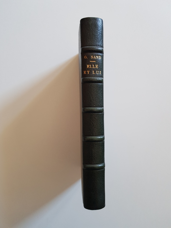 Titre : Elle et Lui Auteur : Sand George Éditeur : Les Belles Éditions Lieu : Paris (63, rue Servan) Date : s.d. - vers 1930 Reliure : Demi-chagrin vert foncé, dos à nerfs orné du titre doré, plats de papier marbré bleu-nuit, gardes blanches. Etat du livre : Bon état. Reliure solide et propre, très légères frottures d'usage aux mors et aux coiffes. Intérieur propre, papier uniformément jauni avec rares rousseurs éparses. Description : Édition populaire du célèbre roman sentimental de George Sand, inspiré de sa relation avec Alfred de Musset. Vignette illustrée en noir et bistre sur la page de titre. Texte en français. Format : In-12 Langue : français