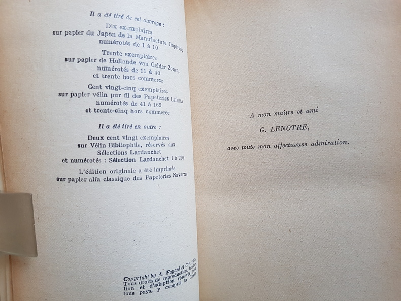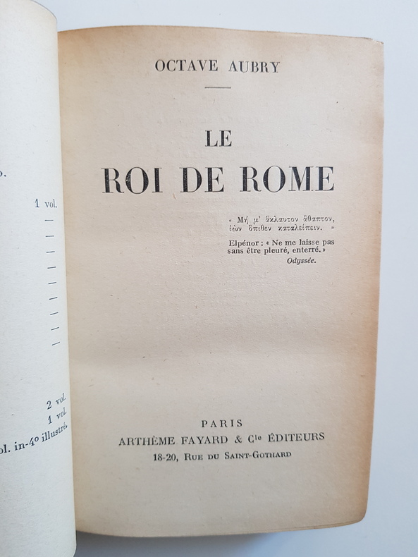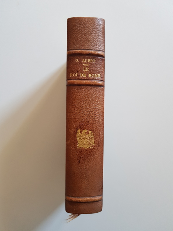 Titre : Le Roi de Rome Auteur : Aubry Octave Éditeur : Arthème Fayard & Cie Lieu : Paris Collection : Les Grandes Études Historiques Date : 1940 Édition : 172e édition Langue : Français Reliure : Demi-cuir de l'époque, dos lisse orné du titre et d'un petit aigle impérial dorés, filets, plats papier marbré vert, signet conservé État du livre : Bon état d'ensemble. Dos légèrement passé et frotté, petites usures aux coiffes et coins émoussés, plats avec frottements superficiels. Intérieur propre, papier uniformément jauni avec discrètes rousseurs, solide Notes : Exemplaire portant le copyright A. Fayard et Cie 1932. Achevé d'imprimer le 11 octobre 1940 par F. Paillart à Abbeville (Somme). Avis de tirage présent mentionnant des exemplaires de tête sur Japon, Hollande, vélin Lafuma et tirage Sélection Lardanchet. Dédicace imprimée de l'auteur à G. Lenôtre