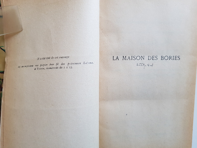 Titre : La Maison des Bories Auteur : Ratel Simonne Collection / mention : Isabelle Comtat - Prix Interallié 1932 Éditeur : Librairie Plon Lieu : Paris Date : 1932 Tirage : 17e mille Reliure : Demi-basane fauve de l'époque, dos lisse orné de filets, deux pièces de titre rouges dorées, plats de papier marbré, signet ancien conservé (fragment) État : Bon exemplaire solide - dos insolé et frotté, petites usures aux coiffes et aux coupes, coins émoussés - intérieur uniformément bruni, rousseurs éparses, ancienne cote au crayon sur la page de faux-titre Particularités : Avis de tirage en début d'ouvrage signalant 25 exemplaires sur papier pur fil (notre exemplaire ordinaire) - achevé d'imprimer et copyright 1932, Typographie Plon, 8 rue Garancière Langue : Français Dimensions : environ 18 x 12 cm Résumé : Roman couronné par le prix Interallié en 1932, publié chez Plon dans la mention Isabelle Comtat. Histoire de milieu rural et familial, écriture sensible et précise, l'un des succès de Simonne Ratel.