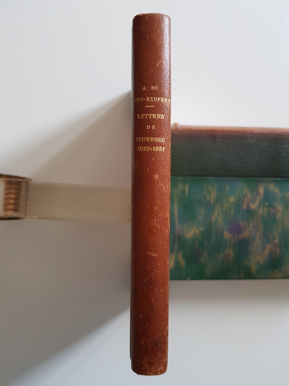 Titre : Lettres de jeunesse 1923-1931 Auteur : Saint-Exupéry Antoine Préface : Renée de Saussine Éditeur : Gallimard - NRF Lieu : Paris Année : 1953 Édition : 11e édition Impression : Achevé d'imprimer le 9 mars 1953 - Dépôt légal 1er trimestre 1953 - N° d'édition 3230 - N° d'impression 2255 Reliure : Demi-basane brune à coins, dos lisse au titre doré, plats papier crème, tranches et coiffes légèrement frottées Format : env. 18 x 12 cm Langue : Français État : Bon état d'usage - dos patiné, coins émoussés, papier uniformément jauni, petite fente discrète en début de charnière, intérieur propre et solide - sans jaquette, couverture d'origine non conservée Description : Réunion de lettres couvrant les années 1923-1931, retraçant la jeunesse et les débuts littéraires d'Antoine de Saint-Exupéry, avec une préface de Renée de Saussine. Tirage et mentions d'impression conformes à l'achevé d'imprimer de 1953.