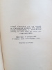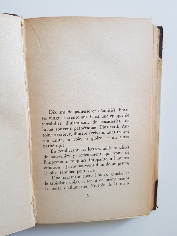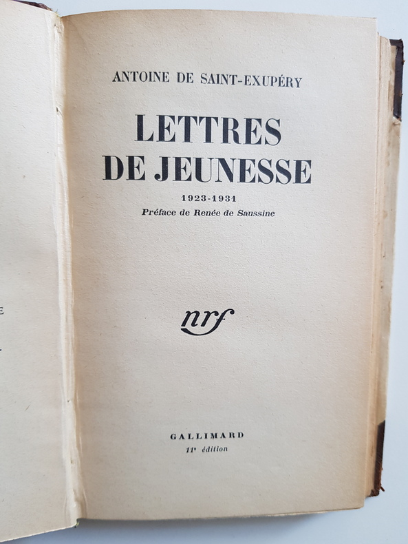 Préface de Renée de Saussine volume in-8, 180x120, relié demi cuir à coins, nom au stylo du précédent propriétaire, 150pp, très bel état. Paris, Gallimard, achevé d'imprimé le 24 juillet 1953 ( Mention de 50e édition) De 1923 à 1931, Antoine de Saint-Exupéry écrit de nombreuses lettres particulièrement touchantes à Renée de Saussine dit « Rinette ». De trois ans son aînée, Renée de Saussine lui est présentée par son frère Bertrand, condisciple d’Antoine au lycée Saint-Louis. Une amitié affectueuse lie Antoine à Renée et traverse les années. Parfois, lorsqu’il se trouve loin d’elle, il lui téléphone. Ne la trouvant que rarement, il lui écrit de nombreuses lettres. Vingt- cinq lettres d’Antoine de Saint-Exupéry à Renée de Saussine ont été publiées dès 1953 sous différents titres : « Lettres à l’amie inventée », « Lettres de jeunesse », « Lettres de jeunesse à l’amie inventée ». Le jeune homme souffre de solitude amoureuse après la rupture de ses fiançailles avec Louise de Vilmorin. Il croit pouvoir trouver l’affection qu’il recherche auprès de Rinette, qui fait semblant de l’ignorer. Il trouve en Rinette, une confidente à la fois proche et inaccessible. Les déclarations voilées alternent avec des reproches moins dissimulés concernant la vie mondaine de Renée qui ne trouve pas le temps de lui répondre. Des dithyrambes littéraires destinées à séduire la jeune fille, apparemment trop frivole, succèdent à des confessions concernant les déceptions d’une vie trop morne avant de déboucher sur des projets d’avenir exaltants. Dans une lettre de 1926, il confie: « J’ai grand besoin d’une amitié à qui confier les petites choses qui m’arrivent. Avec qui partager. Je ne sais pas pourquoi je vous choisis. Vous êtes si étrangère. (…) Je m’écris peut-être à moi-même » Antoine de Saint-Exupéry et Renée de Saussine partagent le même intérêt pour la littérature et les spectacles. Dans sa première lettre, Antoine donne des conseils à Rinette a propos du conte qu’elle lui a confié et cite Dostoïevski. Dans une autre lettre, il s’exprime sur sa conception de la littérature et s’offusque que l’on compare Luigi Pirandello et Henrick Ibsen. Ses premières lettres sont postées des villes qu’il prospecte depuis qu’il est représentant des camions Saurer. Il décrit ses voyages en voiture et les mœurs de province. Il aime raconter des anecdotes comme celle de son chapeau perdu sur un pont à Argenton, et de la discussion avec la jeune modiste du magasin qui lui en vend un nouveau. Il reproche parfois à son amie sa mondanité et il regrette de ne pas être « un beau gigolo avec une belle cravate et une magnifique collection de disques de gramophone ». Il la sens beaucoup plus proche quand, seul, il la « fabrique » à son gré : « C’est peut-être parce que je vous invente que je tiens tellement à vous. » Plus tard, il rejoint Toulouse où est basée la compagnie Latécoère qui vient de l’engager. Il raconte sa vie de pilote et ses voyages en Espagne, au Maroc et au Sénégal. Il décrit ses sensations au moment où son avion en panne est sur le point de s’écraser. Loin de Paris, ses amis lui manquent. Il s’ennuie d’elle et des soirées passées en sa compagnie. Hélas, elle ne répond que rarement à ses lettres et ce silence le fait souffrir. Muté à Buenos où il ne se plait guère, il se réjouit de recevoir son mot qui lui remémore « mille choses adorables et oubliées ». Directeur d’exploitation de l’Aeroposta argentina, filiale de l’Aéropostale, il détaille son travail et ses responsabilités, décrit son appartement et son quotidien. Sa dernière lettre date de 1931 et est écrite d’Agay où demeure sa sœur Gabrielle entourée de sa famille. Elle correspond à la période de son mariage avec Consuelo mais il ne fait aucunement mention de cet événement à Rinette. ref/240