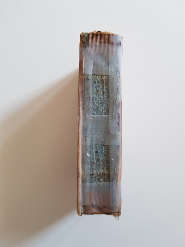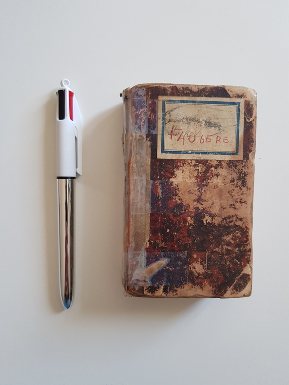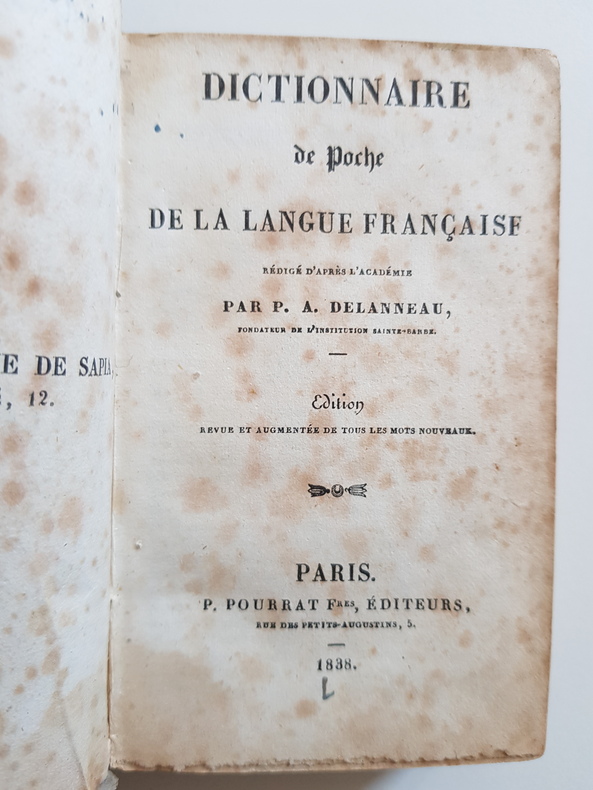Titre : Dictionnaire de poche de la langue française Auteur : Delanneau P.-A. Éditeur : P. Pourrat Frères, éditeurs Lieu : Paris Date d'édition : 1838 Édition : Revue et augmentée de tous les mots nouveaux, rédigée d'après l'Académie Imprimeur : Imprimerie de Sapia, rue du Doyenné, 12 (Paris) Langue : Français Format : Petit in-16, env. 13 x 8 cm Reliure : Reliure d'époque à plats papier marbré ; dos très fatigué et en grande partie recouvert d'un ruban adhésif ancien ; coins émoussés ; petite étiquette manuscrite collée au premier plat État du livre : Exemplaire solidement complet mais très usagé – fortes rousseurs et brunissures sur l'ensemble, quelques mouillures éparses, marges parfois cornées, petites déchirures marginales sans manque, charnières fragiles, coiffes abîmées ; nom ou mention manuscrite ancienne sur l'étiquette de couverture Description : Petit dictionnaire portatif du XIXe siècle, en colonnes, donnant définitions et indications grammaticales. Ouvrage de Delanneau, fondateur de l'Institution Sainte‑Barbe, ici dans une édition revue et augmentée conforme à l'Académie. Adresse d'éditeur : Rue des Petits‑Augustins, 5, Paris Particularités : Exemplaire de poche d'époque, intéressant témoignage de la lexicographie française avant les grandes réformes orthographiques