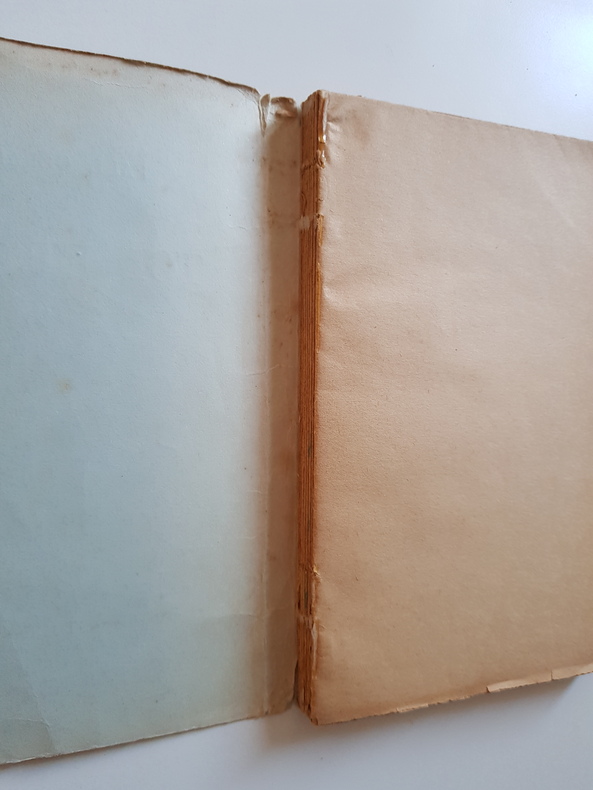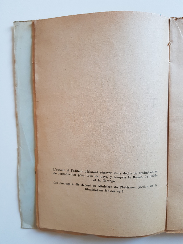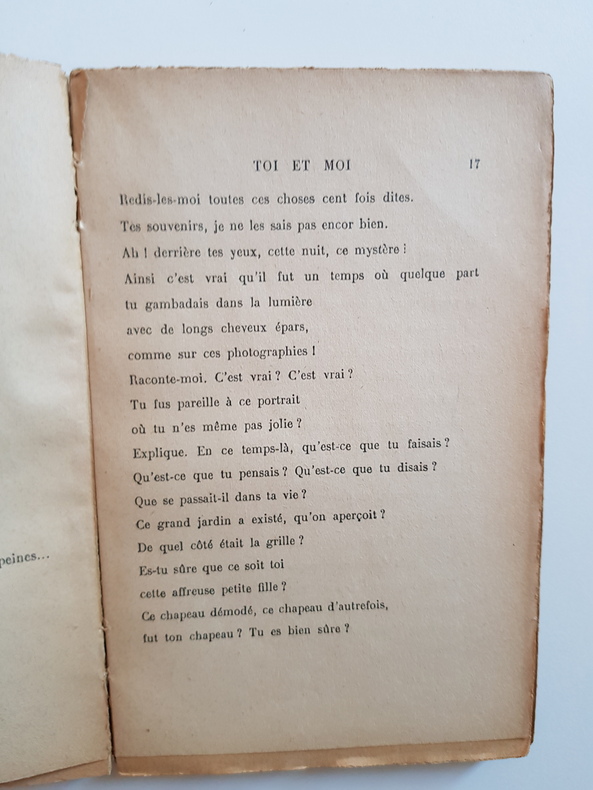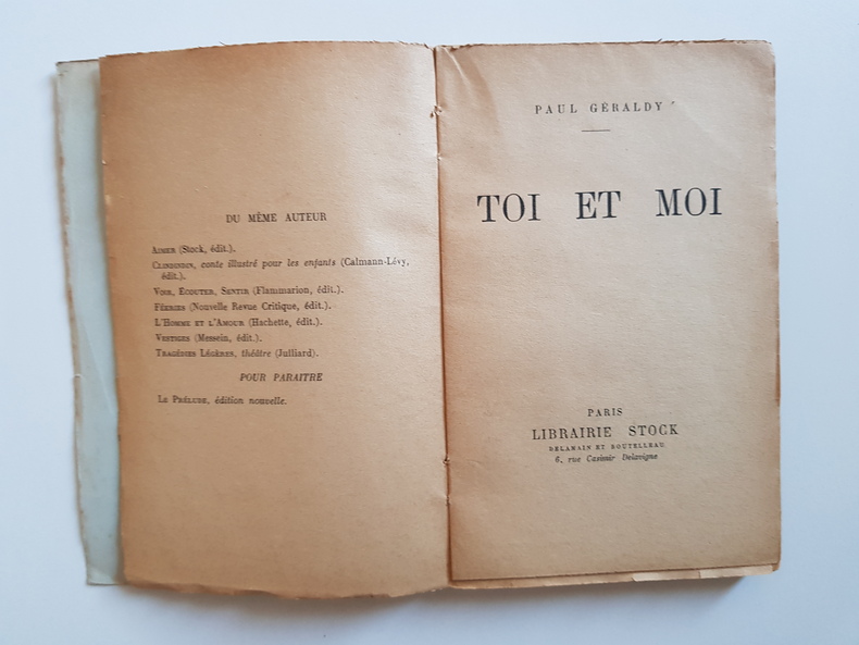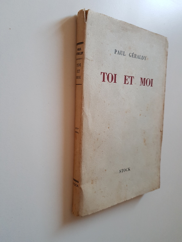 Titre : Toi et moi Auteur : Géraldy Paul Éditeur : Librairie Stock - Delamain et Boutelleau Lieu : Paris Date : 1913 (mention de dépôt légal) Reliure : Broché - couverture d'origine imprimée Format : 18,5 x 12 cm Langue : Français État : Moyen - couverture pâlie et piquée, traces de salissures, coins et bords frottés, dos froissé avec petites déchirures et manques en tête et en pied, mors fragilisés, charnières internes ouvertes, cahiers encore solidaires, papier uniformément jauni avec rousseurs éparses, bords parfois ébréchés, sans annotations ni surlignages visibles. Description : Édition ancienne du célèbre recueil de poèmes amoureux de Paul Géraldy, publié chez Stock. Page de copyright portant la réserve des droits et la mention de dépôt légal en janvier 1913. Un classique de la poésie française du début du XXe siècle.