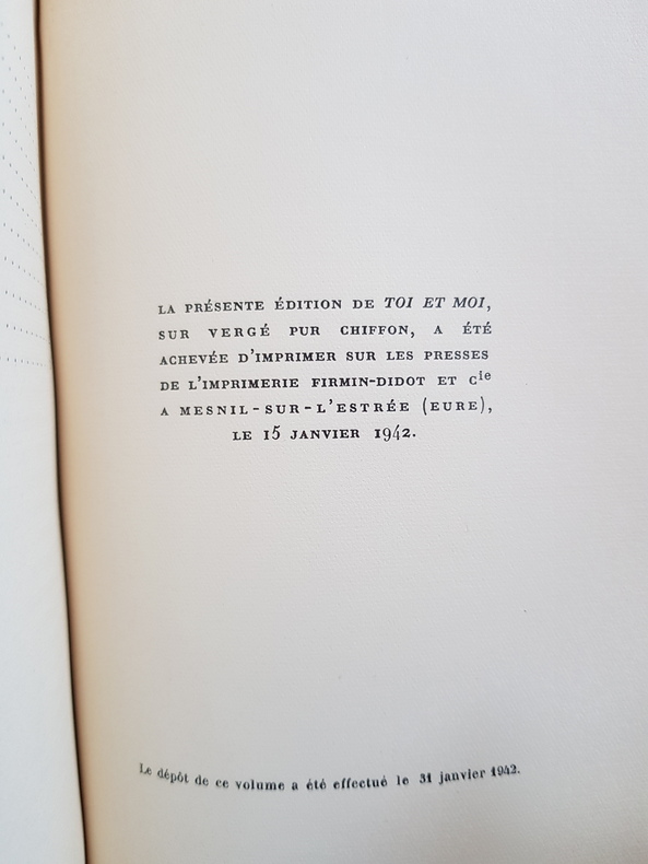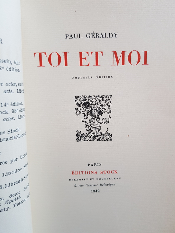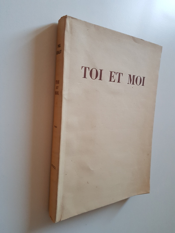 Titre : Toi et moi Auteur : Géraldy, Paul Éditeur : Éditions Stock – Delamain et Boutelleau Lieu : Paris Date : 1942 Édition : Nouvelle édition Reliure : Broché d'éditeur – couverture crème imprimée en brun, dos titré État du livre : Bon état – légères marques d'usage : couverture légèrement jaunie et piquée avec quelques petites taches, coins très légèrement froissés, dos un peu ridé et coiffes discrètement frottées ; intérieur très frais Imprimeur : Imprimerie Firmin-Didot et Cie, Mesnil-sur-l'Estrée (Eure) Papier : Vergé pur chiffon Achevé d'imprimer : 15 janvier 1942 Dépôt légal : 31 janvier 1942 Langue : Français Contenu : Célèbre recueil poétique de Paul Géraldy, vers sur l'amour et la vie à deux, ici dans une élégante impression sur vergé