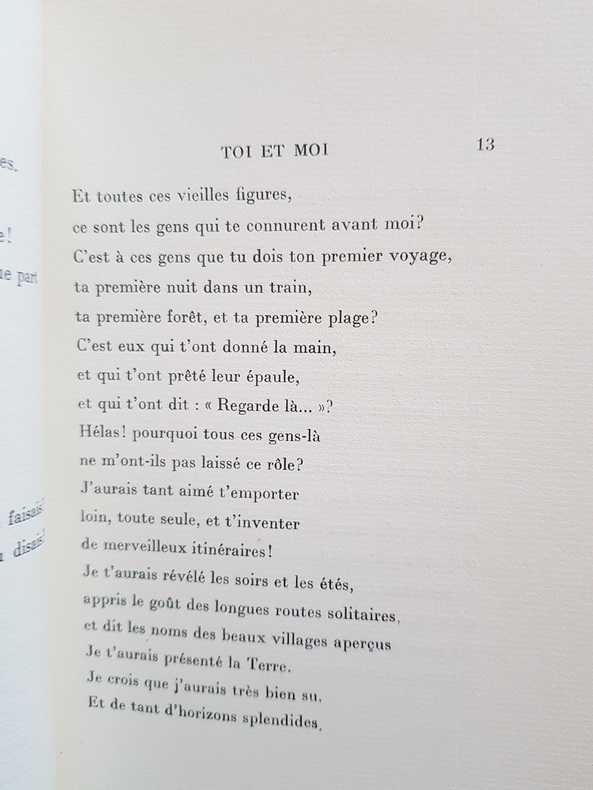 Nouvelle édition, 2 dessins de Edouard Vuillard vol relié, jolie reliure demi cuir, 210x145, état neuf, couvertures d'origines conservées avec dos, 172pp. Exemplaire numéroté. Paris, Cres & Cie, 1923 "Toi et Moi" est un recueil de poèmes de l'écrivain français Paul Géraldy, publié en 1912. Paul Géraldy, de son vrai nom Paul Lefèvre, était un poète et dramaturge français. "Toi et Moi" est considéré comme l'œuvre la plus célèbre de Paul Géraldy. Il s'agit d'un recueil de poèmes dédié à l'amour et aux relations amoureuses. Les poèmes explorent les différentes facettes de l'amour, depuis les premiers émois jusqu'aux joies et aux peines de la vie à deux. Les poèmes de "Toi et Moi" sont souvent empreints de sensualité et de romantisme. Ils expriment les sentiments intenses ressentis dans une relation amoureuse et explorent les thèmes de l'intimité, de la passion et de la complicité. Paul Géraldy était connu pour son style élégant et émotionnel. Ses poèmes sont empreints de lyrisme et de délicatesse, capturant les émotions les plus subtiles de l'amour. "Toi et Moi" a connu un grand succès à sa sortie et a été très apprécié par le public. Les poèmes de ce recueil ont souvent été cités et repris dans d'autres œuvres littéraires, et certains sont même devenus des classiques de la poésie amoureuse française. "Toi et Moi" reste une référence dans le domaine de la poésie amoureuse et continue d'être lu et apprécié par les amateurs de poésie romantique. ref/18