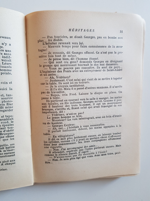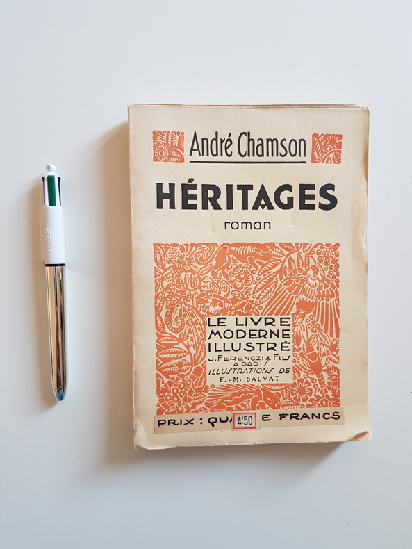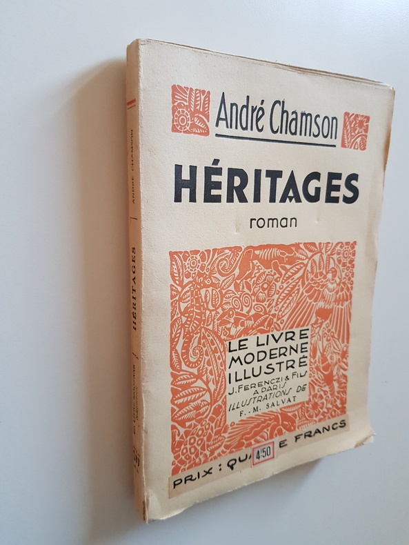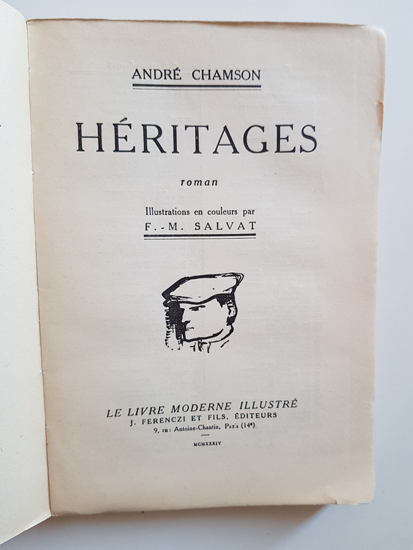 Titre : Héritages Auteur : Chamson André Éditeur : J. Ferenczi et Fils Collection : Le Livre Moderne Illustré Lieu d'édition : Paris Date : 1934 Illustrateur : F.-M. Salvat Langue : Français Reliure : Broché, couverture imprimée d'origine, sans jaquette (comme paru) Format : in-12 - env. 19 x 12,5 cm Etat : Bon état d'ensemble - couverture avec petites usures et froissements aux bords et aux coins, dos légèrement ridé, infimes déchirures marginales, papier uniformément jauni, intérieur propre et solidement relié Description : Roman d'André Chamson dans la collection Le Livre Moderne Illustré, orné de nombreuses illustrations en couleurs et en noir par F.-M. Salvat (planches et vignettes). Achevé d'imprimer sur les presses de l'Imprimerie Moderne, 177 route de Châtillon, à Montrouge, le 12 novembre 1934. Papier de luxe, impression soignée ISBN : Non précisé Provenance ou particularités : Prix d'éditeur d'époque mentionné au 1er plat (4,50 F)