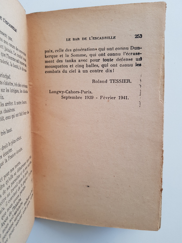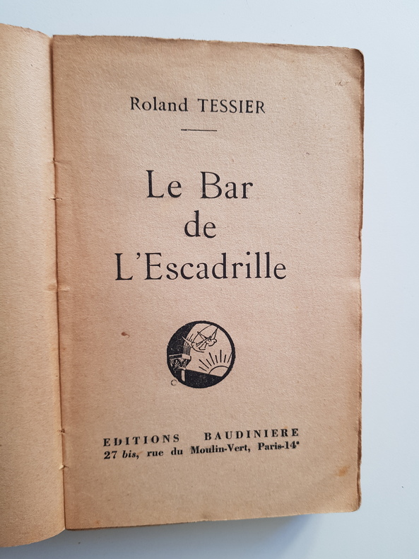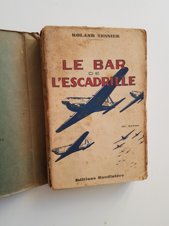 itre : Le Bar de l'Escadrille Auteur : Tessier Roland Éditeur : Éditions Baudinière Lieu : Paris Date : vers 1941 Édition : 150e édition. Notice de tirage mentionnant 100 ex. sur vélin du Marais numérotés 1-100 et 250 ex. sur Alfa mousse Navarre numérotés 101-350 constituant l'édition originale proprement dite. Exemplaire courant non numéroté. Reliure : Reliure cartonnée marbrée d'époque, dos orné, couverture illustrée d'origine conservée. Langue : Français Description : Chroniques et récit de guerre sur l'aviation française au début de la Seconde Guerre mondiale, écrites entre Longwy, Cahors et Paris, septembre 1939 - février 1941. Portraits d'aviateurs, scènes de base et de missions, alertes de D.C.A., évocations de Dunkerque et de la Somme. Un document vif sur l'atmosphère des escadrilles et l'arrière immédiat pendant la campagne 1939-1940. État : Bon état d'usage - papier bruni, petites rousseurs et usures de couverture, reliure solide, bords frottés.