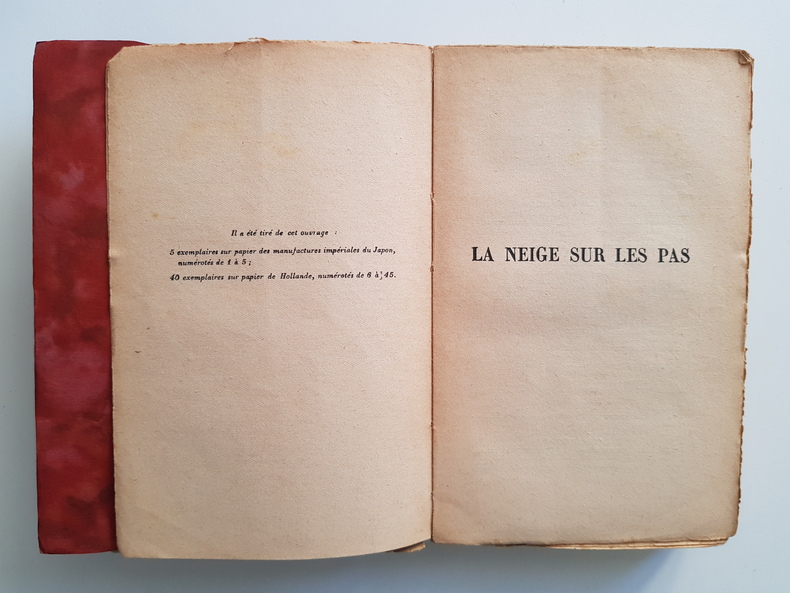 Titre : La Neige sur les pas Auteur : Bordeaux, Henry Éditeur : Librairie Plon, Plon-Nourrit et Cie, Imprimeurs-Éditeurs Date de publication : 1912 Lieu de publication : Paris Reliure : Broché sous couverture d'époque protégée par un papier marbré rouge État du livre : Bon état général, papier uniformément jauni, couverture originale présente et légèrement froissée Édition : Cent trente-sixième édition Détails : Roman d'Henry Bordeaux, de l'Académie française, publié en 1912 chez Plon-Nourrit et Cie, 8 rue Garancière, Paris. Page de tirage précisant 5 exemplaires sur papier des manufactures impériales du Japon et 40 sur papier de Hollande. Dédicace « À Paul Bourget » en tête du texte. Copyright 1912 par Plon-Nourrit et Cie. Langue : Français Dimensions : env. 12 x 19 cm