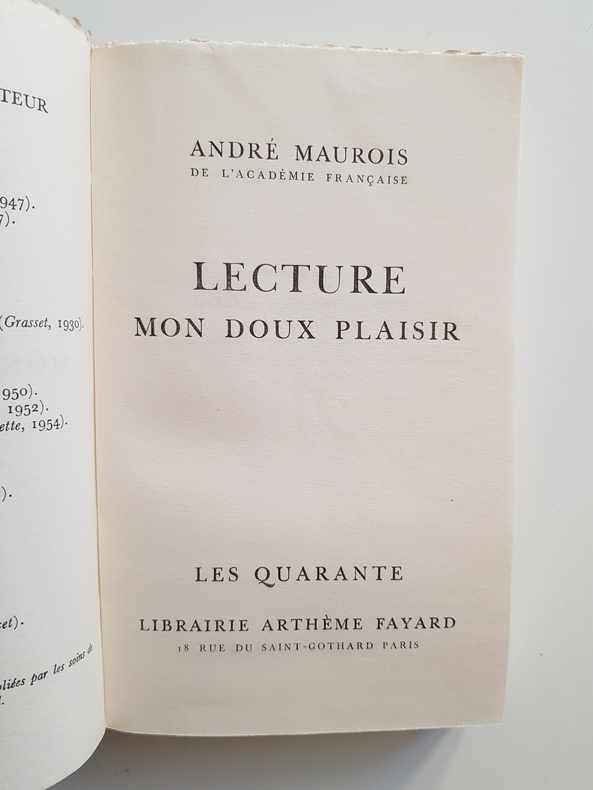Titre : Lecture, mon doux plaisir Auteur : Maurois, André Éditeur : Librairie Arthème Fayard Date de publication : 1957 Lieu de publication : Paris Reliure : Broché, couverture crème imprimée en brun, non rogné État du livre : Bon état, intérieur frais, papier de belle qualité, légères marques d'usage sur la couverture Édition : Édition originale, troisième volume de la collection Les Quarante Détails : Ouvrage d'André Maurois de l'Académie française, publié dans la collection Les Quarante. Achevé d'imprimer le 10 octobre 1957 sur les presses de l'Imprimerie Firmin-Didot (Le Mesnil-sur-l'Estrée, Eure). Tirage limité à 75 exemplaires : 25 sur papier Lafuma numérotés de 1 à 25, et 50 sur papier alfa numérotés de 26 à 75. Citation de Flaubert en exergue : « Lisez les maîtres en tâchant de saisir leurs procédés... ». Langue : Français Dimensions : env. 13 x 19 cm