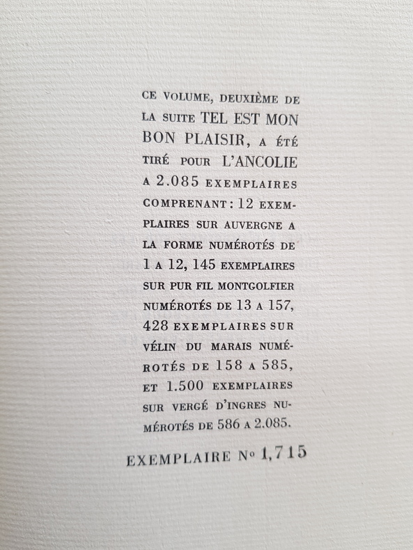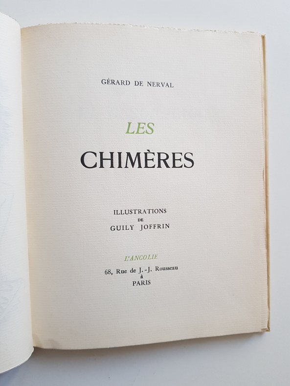 Titre : Les Chimères Auteur : Nerval Gérard de Illustrateur : Joffrin Gily Éditeur : L'Ancolie Lieu de publication : Paris Adresse de l'éditeur : 68, rue de J.-J. Rousseau Collection / Mention : Tel est mon bon plaisir - Deuxième volume de la suite Date de publication : non datée (vers milieu XXe siècle) Langue : Français Format : Broché (in-8) Description : Édition illustrée du recueil poétique Les Chimères de Gérard de Nerval, ornée de compositions originales en noir et blanc de Gily Joffrin. Publiée par L'Ancolie à Paris dans la série « Tel est mon bon plaisir ». Tirage limité à 2 085 exemplaires : 12 sur Auvergne, 145 sur pur fil Montgolfier, 428 sur vélin du Marais et 1 500 sur vergé d'Ingres, dont cet exemplaire porte le n° 1 715. Impression sur papier vergé d'Ingres de belle qualité. Ouvrage d'art recherché, célébrant l'un des sommets du romantisme français. État du livre : Bon état, intérieur frais et propre, couverture bien conservée avec infimes traces d'usage. Exemplaire numéro 1715