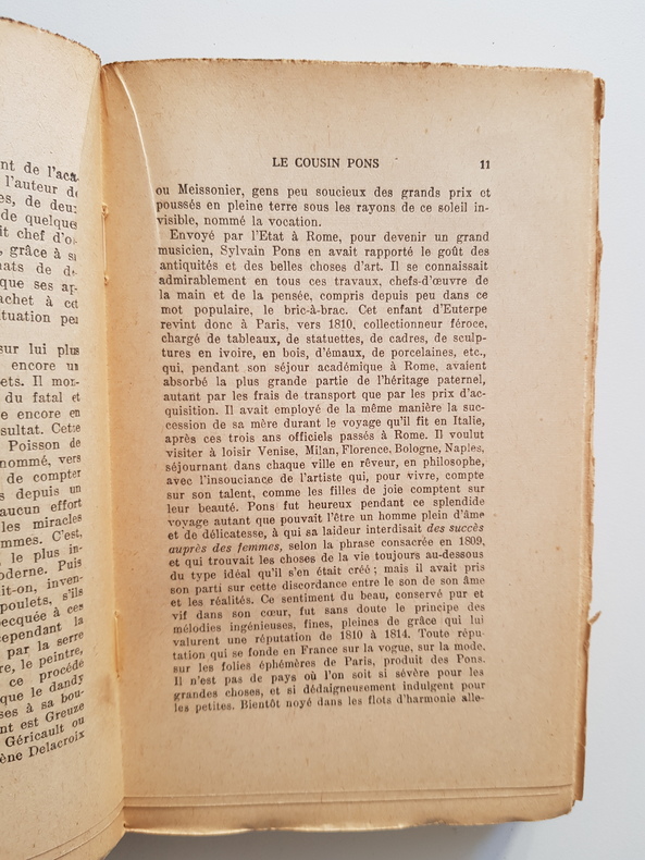 Titre : Le Cousin Pons Auteur : Balzac Honoré de Cycle/Collection : Les Parents pauvres - La Comédie humaine Éditeur : Ernest Flammarion Lieu : Paris Date : 1930 Reliure : Cartonnage amateur papier marbré, dos lisse avec petite étiquette manuscrite, couverture imprimée d'origine conservée Langue : Français État du livre : Bon état d'usage Description : Édition Flammarion du classique de la Comédie humaine consacré à Sylvain Pons, musicien et collectionneur passionné, et à son amitié avec Schmucke. Fresque du Paris du XIXe siècle, dénonçant cupidité et arrivisme autour d'une collection d'art convoitée. Rousseurs et brunissures d'usage, coiffes et coins légèrement émoussés. Achevé d'imprimer : Bar-le-Duc, Imprimerie Comte-Jacquet, 10-30.