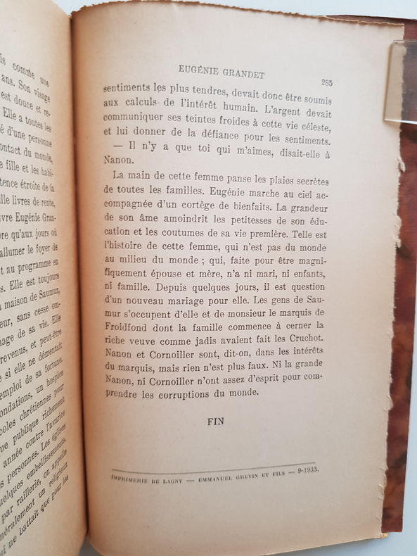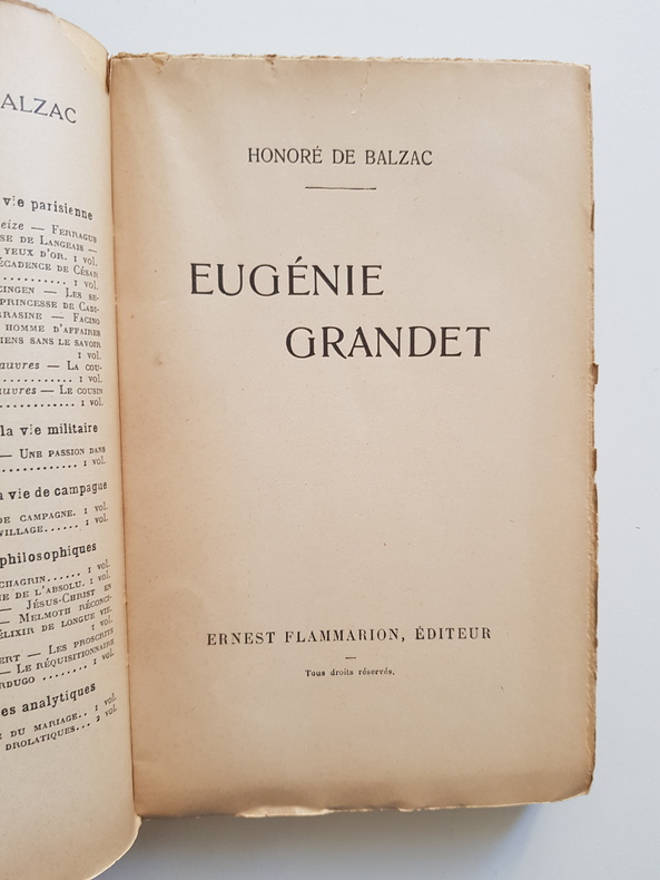 Titre : Eugénie Grandet Auteur : Balzac Honoré de Éditeur : Ernest Flammarion, Éditeur Lieu : Paris Date : 1935 Reliure : Demi-cuir brun, plats papier marbré, filets dorés, couverture d'origine imprimée conservée État du livre : Bon - traces d'usage et frottements aux coupes, papier jauni, petites usures en bords, étiquette papier manuscrite au pied du dos, intérieur propre Langue : Français Description : Édition Flammarion des années 1930 du grand roman de la Comédie humaine. Achevé d'imprimer à l'Imprimerie de Lagny - Emmanuel Grevin et Fils - 9-1935. Exemplaire relié après coup avec conservation des couvertures éditeur. Mots clés : Eugénie Grandet, Comédie humaine, Balzac, littérature française, roman réaliste, classique, Saumur, avarice, XIXe siècle, Flammarion
