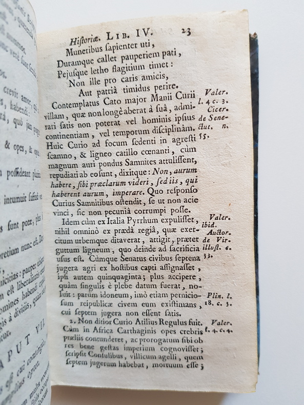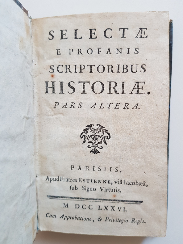 Titre : Selectæ e profanis scriptoribus historiæ. Pars altera Auteur : Anonyme Lieu d’édition : Paris Éditeur : Fratres Estienne (via Jacobæa, sub signo Virtutis) Date d’édition : 1786 Langue : Latin Format : in-12 Reliure : Dos en basane d’époque, plats papier marbré État du livre : Bon état d’usage – frottements et usures aux plats, coins émoussés, coiffes et mors frottés ; papier avec quelques rousseurs éparses, ensemble solide et propre Particularités : Seconde partie seule ; impression pré‑révolutionnaire avec la mention « Cum approbatione, & Privilegio Regis ». Recueil d’extraits historiques et moraux tirés des auteurs latins dits « profanes » ; citations et renvois à Cicéron, Valerius Maximus, Pline, etc.