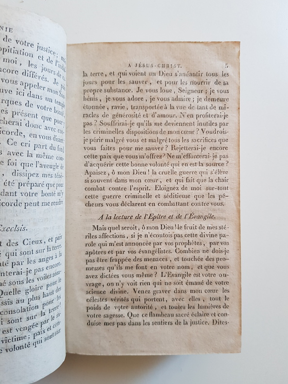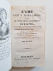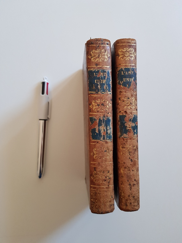 Titre : L'Âme unie à Jésus‑Christ dans le très saint sacrement de l'autel, ou préparations et actions de grâces pour la sainte communion, puisées dans l'Évangile des dimanches et des principales fêtes de l'année Auteur : Carcado Comtesse de Lieu : Besançon Éditeur : Ant. Montarsolo et Cie, libraires Date : 1827 Volumes : 2 tomes Format : in‑12, env. 18 x 11 cm Illustrations : un portrait gravé en frontispice Reliure : pleines basanes marbrées de l'époque, dos lisses ornés de fleurons et filets dorés, pièces de titre bleues, tranches mouchetées Langue : français Description : Édition posthume de l'ouvrage de dévotion de la comtesse de Carcado, proposant prières et méditations avant et après la communion pour les dimanches et principales fêtes de l'année. L'ouvrage est précédé d'un éloge historique par l'abbé Duquesne, vicaire général de Soissons. Ensemble complet des deux tomes. État : frottements marqués aux dos et aux plats, coiffes et coins émoussés, mors localement fendus sans manque de solidité, pièces de titre éraflées, brunissures et rousseurs éparses ; intérieur correct et reliures encore solides.