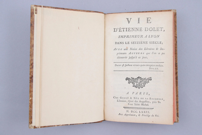 NEE DE LA ROCHELLE, Jean-François (1751-1838). Vie d'Etienne Dolet, imprimeur à Lyon dans le seizième siècle ; avec une notice des libraires et imprimeurs auteurs que l'on a pu découvrir jusqu'à ce jour.. Paris, Gogué et Née de la Rochelle. 1779 In-8, VIII et 202 pages. 1/2 veau pastiche moderne ; reliure bien établie. . Bon exemplaire de l'édition originale. Première bibliographie et première biographie d'Etienne Dolet, brûlé avec ses livres place Maubert le 3 août 1546.
