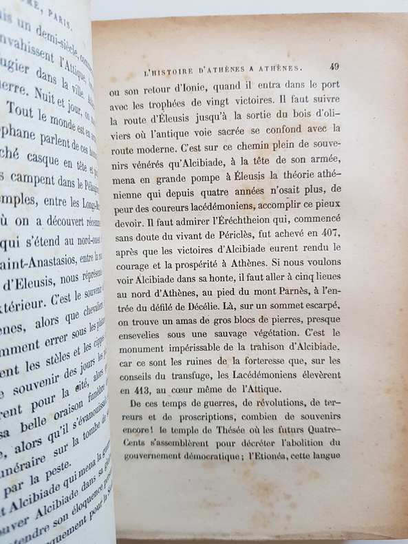 Titre : Athènes, Rome, Paris - L'histoire et les mœurs Auteur : Houssaye Henry Éditeur : Calmann Lévy, éditeur (ancienne maison Michel Lévy Frères) Lieu et date : Paris, 1879 Édition : Troisième édition Format : In-12 (env. 18,5 x 12 cm) Reliure : Demi-chagrin rouge, dos à nerfs, titre et filets dorés, plats papier marbré Illustrations : Non illustré Langue : Français État : Bon état. Dos légèrement frotté, petites usures en coiffes. Plats marbrés propres. Intérieur complet, papier bruni avec rousseurs éparses, cahiers bien solidaires. Description : Belle édition reliée d'un classique de Henry Houssaye consacré à l'histoire comparée et aux mœurs d'Athènes, de Rome et de Paris, du monde antique au XIXe siècle. Ouvrage érudit et vivant, reflet de la curiosité historique et littéraire de l'auteur, ici dans sa troisième édition chez Calmann Lévy.