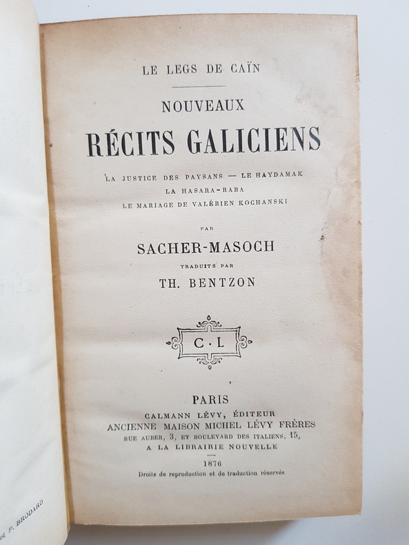Titre : Le legs de Caïn. Nouveaux récits galiciens - La Justice des paysans - Le Haydamak - La Hasara-Raba - Le mariage de Valérien Kochanski Auteur : Sacher-Masoch Leopold von Traducteur : Bentzon Th. Éditeur : Calmann Lévy, éditeur (Ancienne Maison Michel Lévy Frères). À la Librairie Nouvelle Lieu d'édition : Paris Date d'édition : 1876 Langue : français Reliure : demi-chagrin bordeaux à coins, plats marbrés rouges et noirs, dos lisse titré or Format : environ 18 x 12 cm Description : Exemplaire avec ex-libris ancien au premier contreplat. Envoi manuscrit de l'éditeur au faux-titre. Papier bruni avec rousseurs éparses, petite ondulation et légère auréole claire aux premières feuilles, coupes et coins très légèrement frottés. Titre complet conforme à la page de titre, volume de la série « Le legs de Caïn », traduction française par Th. Bentzon pour Calmann Lévy (1876).