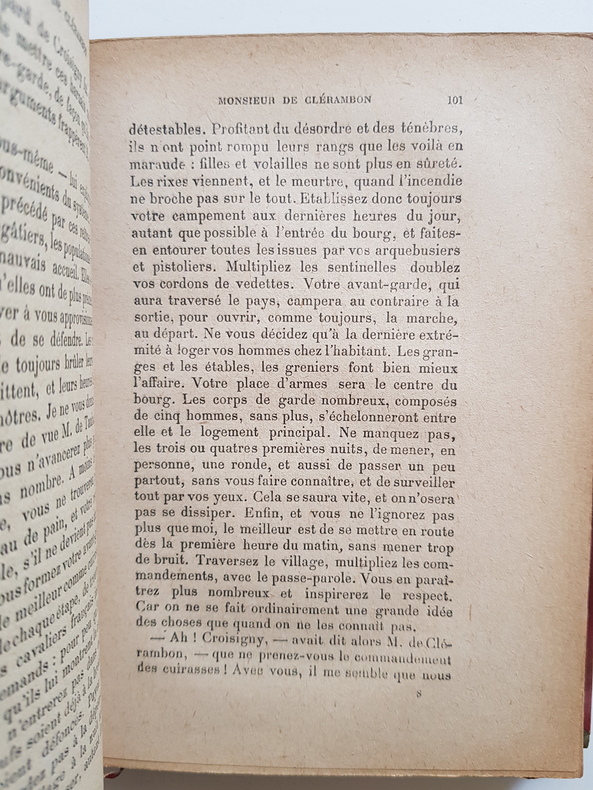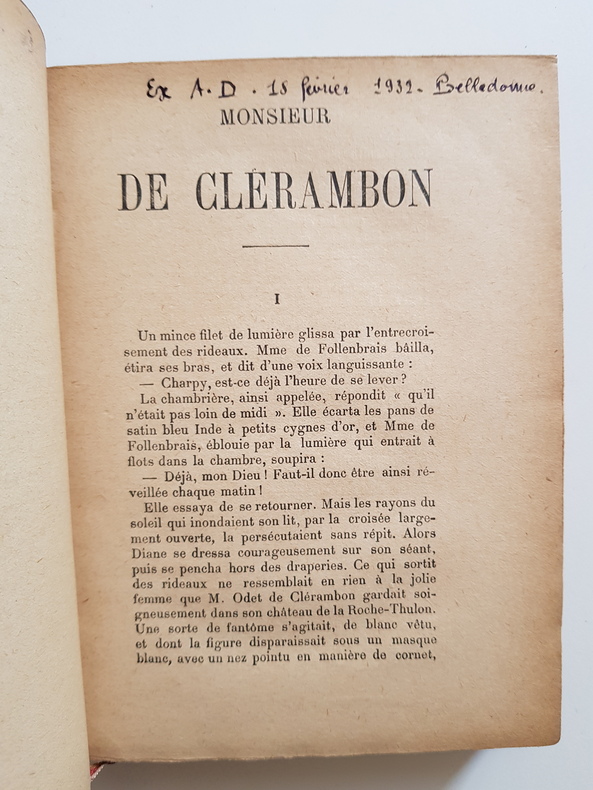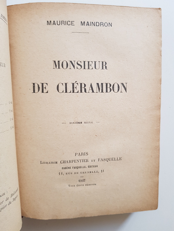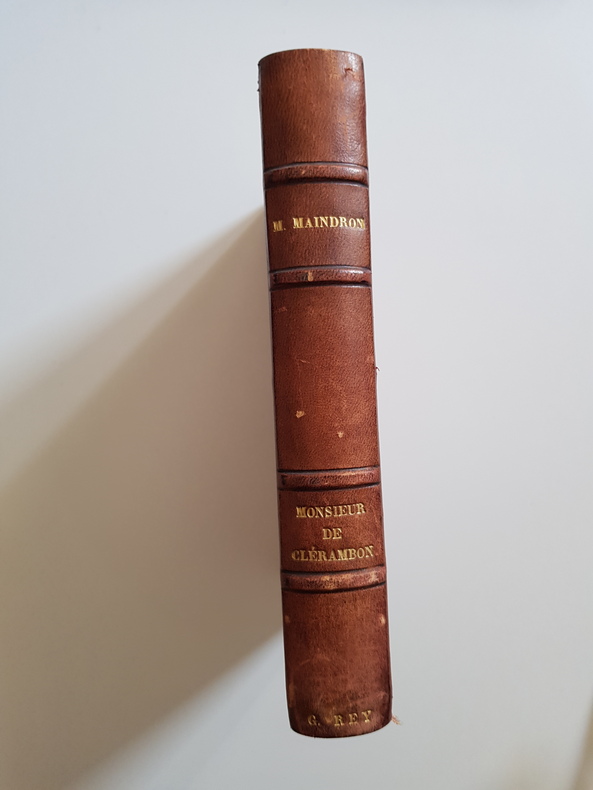 Titre : Monsieur de Clérambon Auteur : Maindron Maurice Éditeur : Librairie Charpentier et Fasquelle - Eugène Fasquelle, éditeur Lieu et date : Paris, 1927 Édition : Dixième mille Format : In-12 (env. 18,5 x 12 cm) Reliure : Demi-chagrin rouge, dos à nerfs, titre doré, plats papier marbré nuagé Illustrations : Frontispice en couleurs signé Langue : Français État : Bon état. Dos et coiffes légèrement frottés, petites marques d'usage. Intérieur complet, papier uniformément jauni avec rousseurs éparses, quelques notes/mentions anciennes au premier feuillet, cahiers solides. Description : Roman historique de Maurice Maindron, situé à la Renaissance, l'un de ses grands succès populaires. Cette impression de 1927 chez Fasquelle présente un frontispice en couleurs et une élégante reliure demi-chagrin.